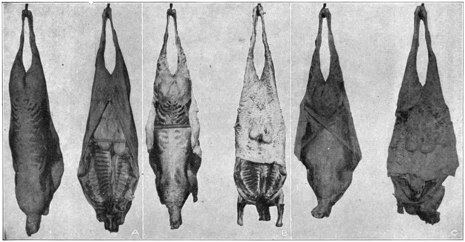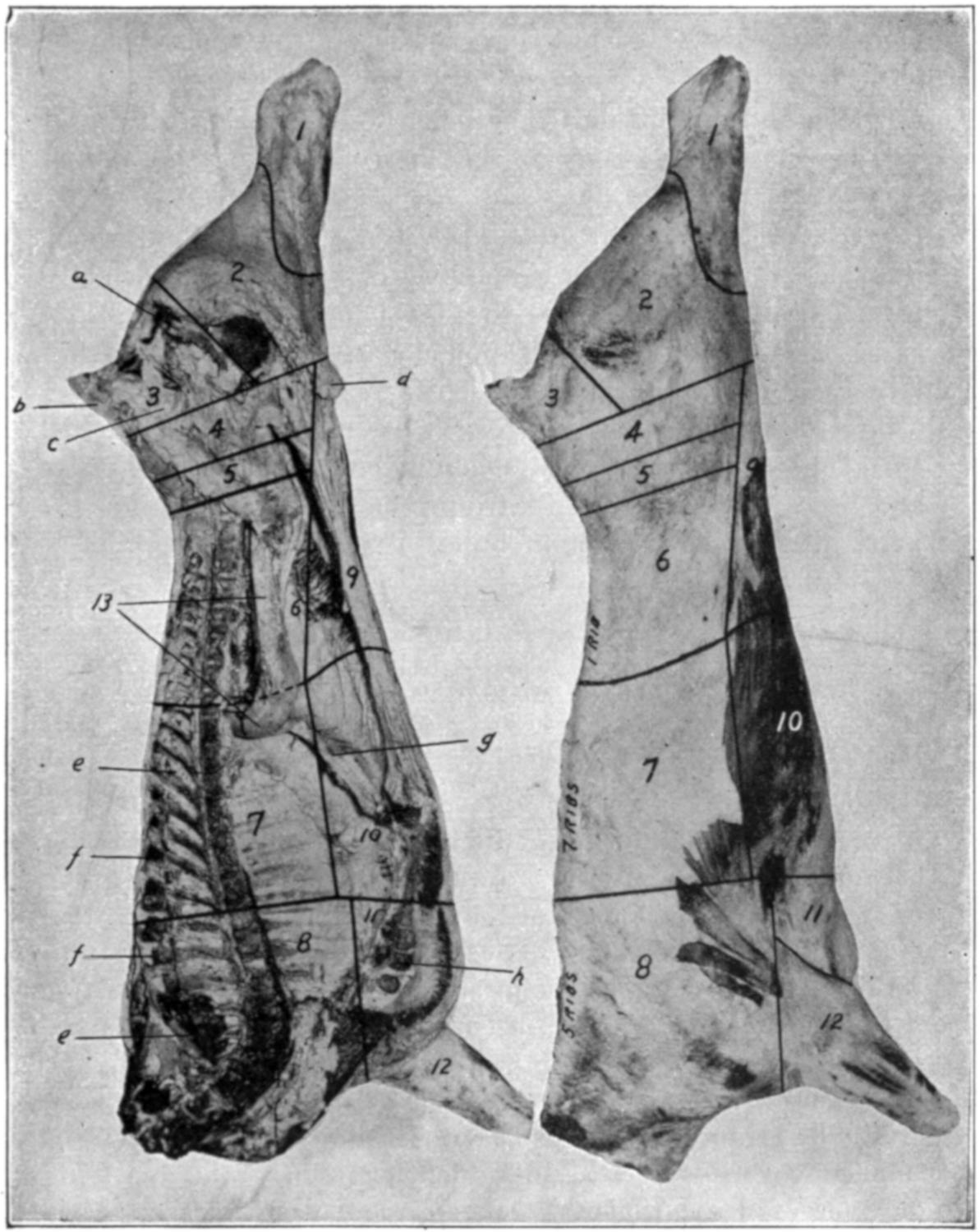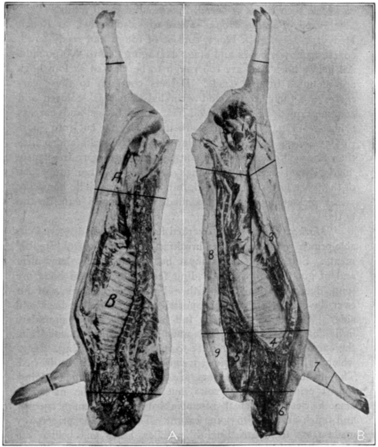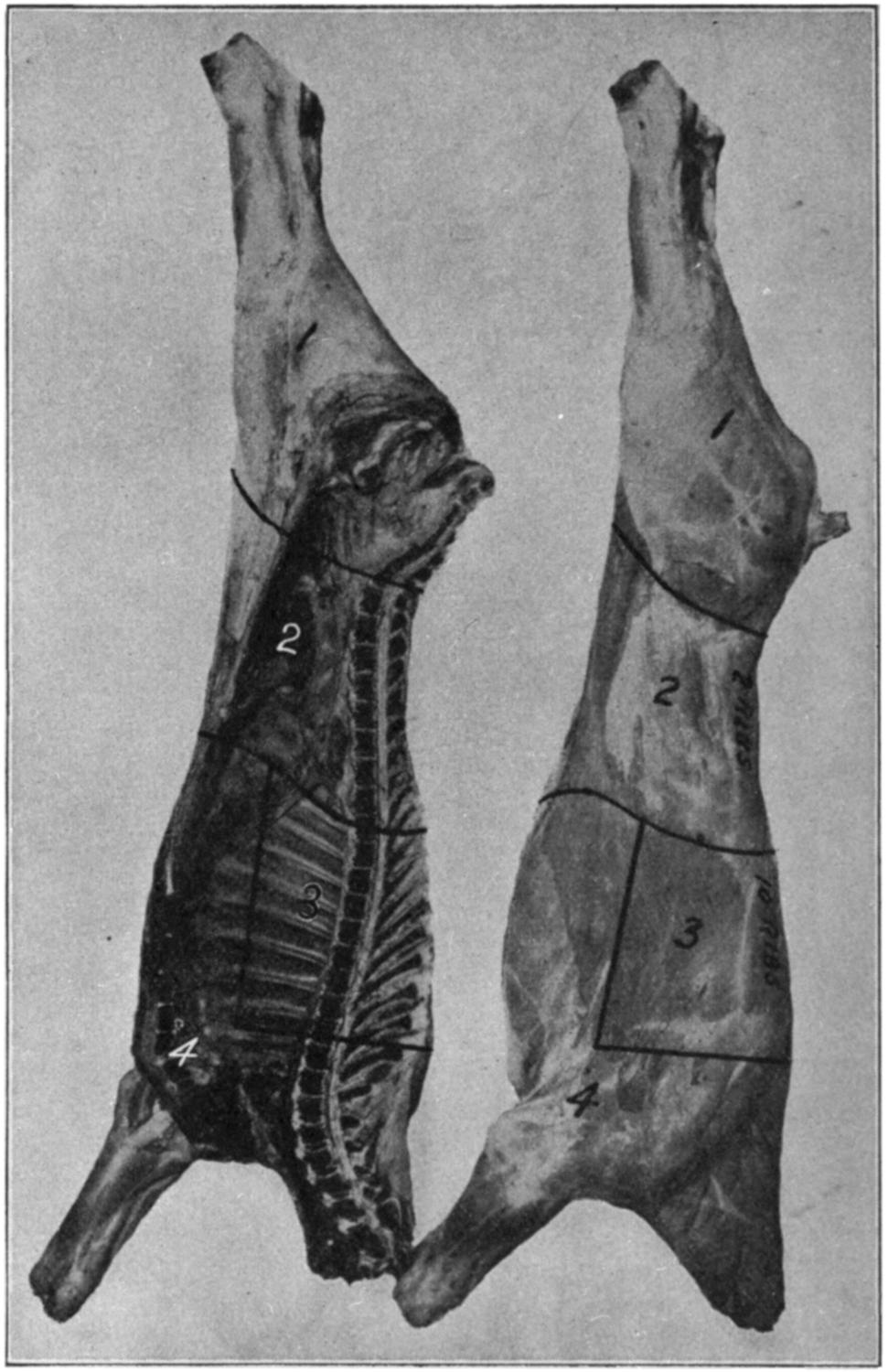 | Yields of Cattle — Yield from Twenty-two Native Cattle — Yield from Fifty-nine Texas Cattle — Yield from Twenty Heavy Cattle — Yield from Thirty-four Cattle — Percentage of Various Cuts — Beef Cuts — Diagram of Cutting — Grading — Loins — Ribs — Rounds — Chucks — Plates, Shanks and Flanks — Barreled Beef. | |