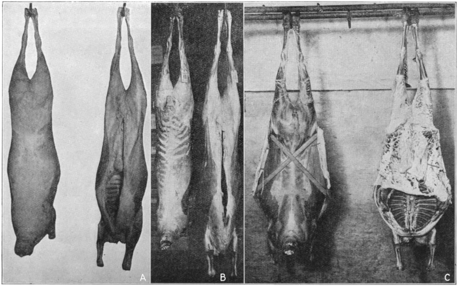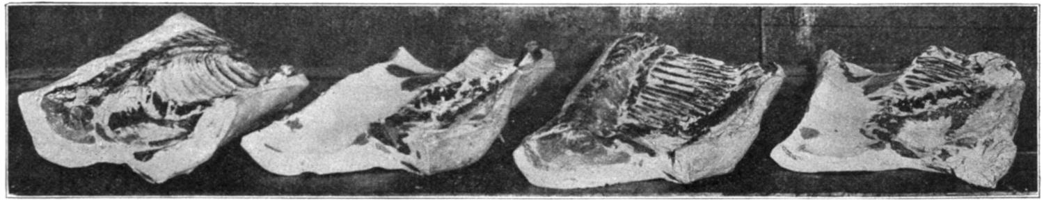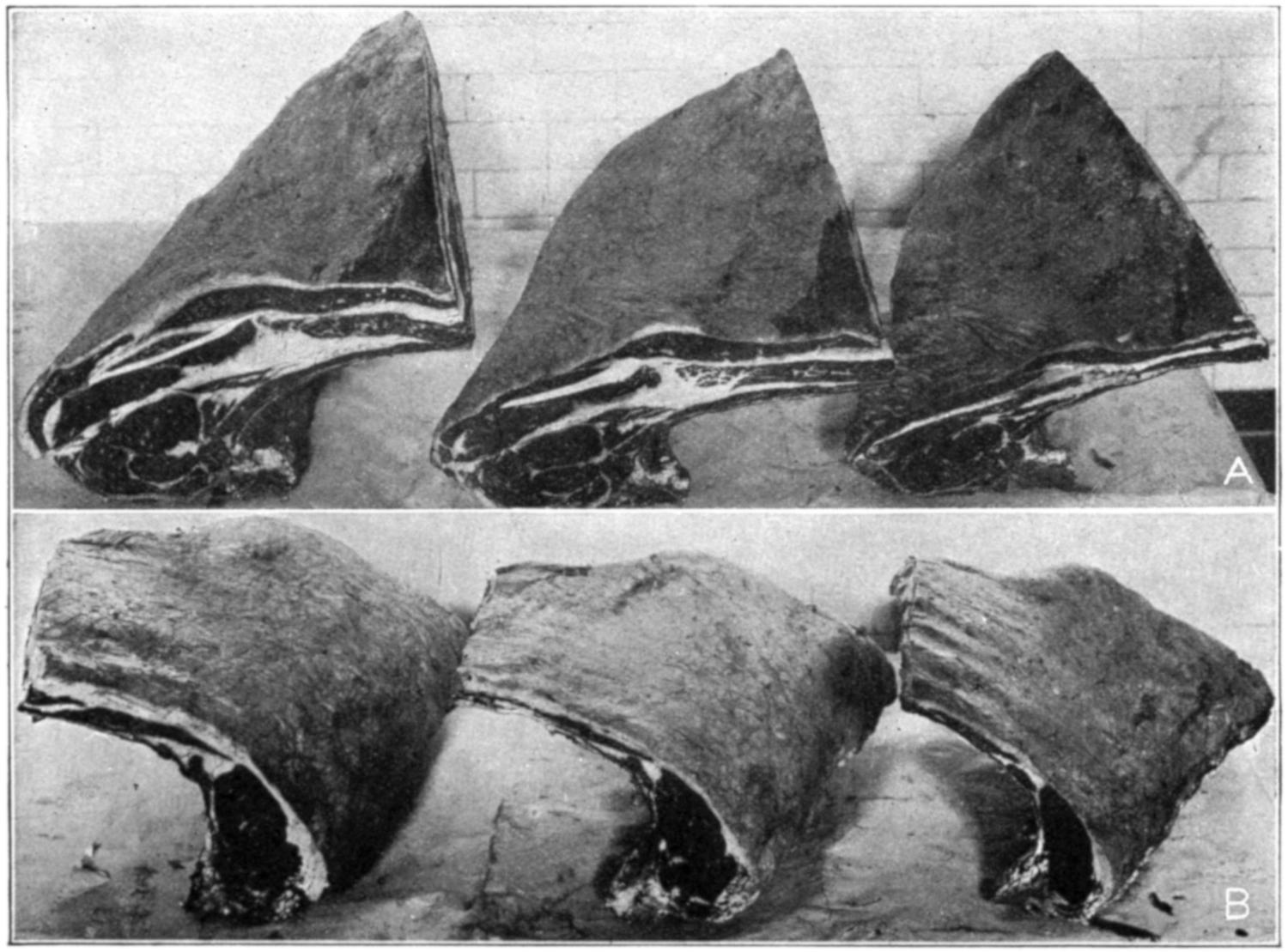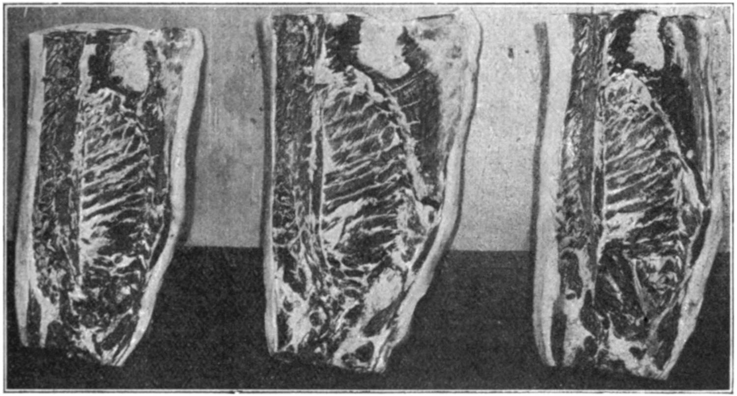 | Yields of Cattle — Yield from Twenty-two Native Cattle — Yield from Fifty-nine Texas Cattle — Yield from Twenty Heavy Cattle — Yield from Thirty-four Cattle — Percentage of Various Cuts — Beef Cuts — Diagram of Cutting — Grading — Loins — Ribs — Rounds — Chucks — Plates, Shanks and Flanks — Barreled Beef. | |