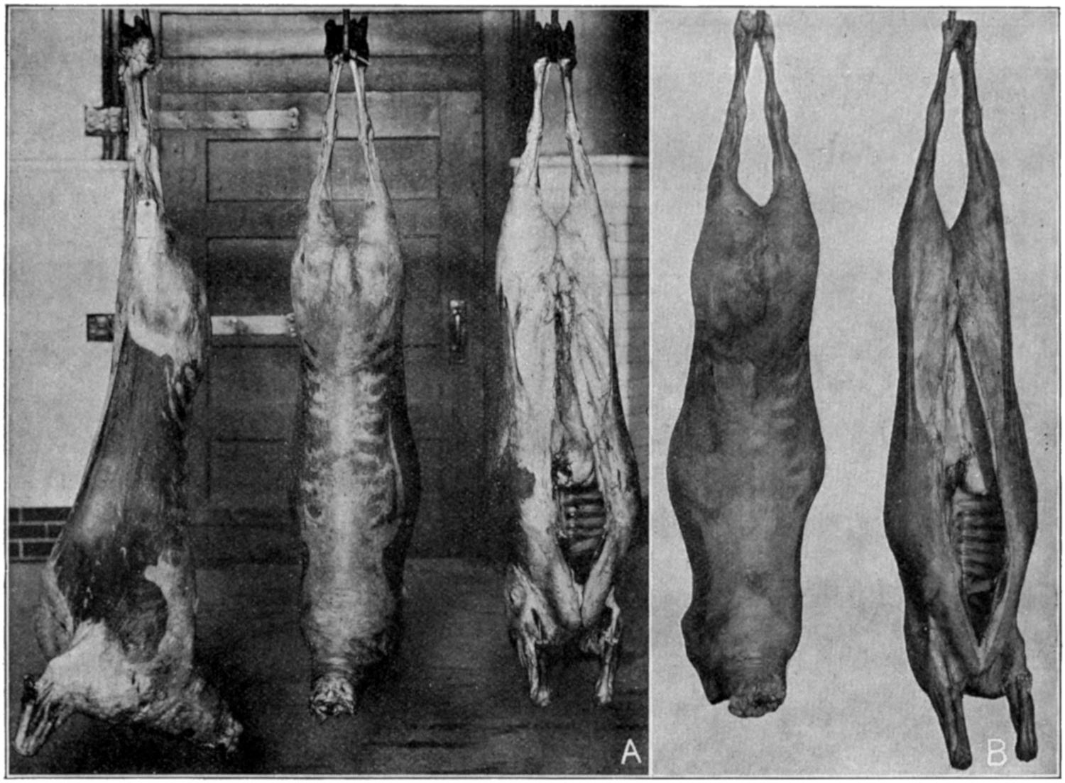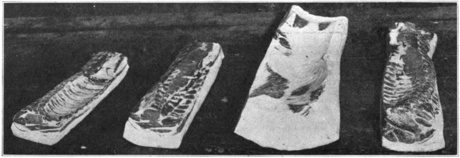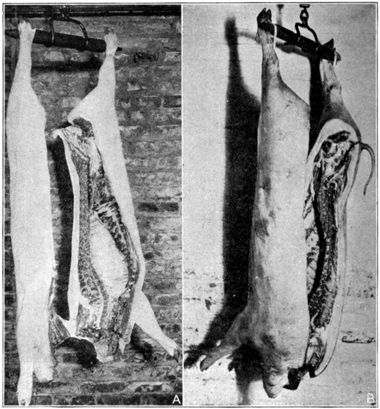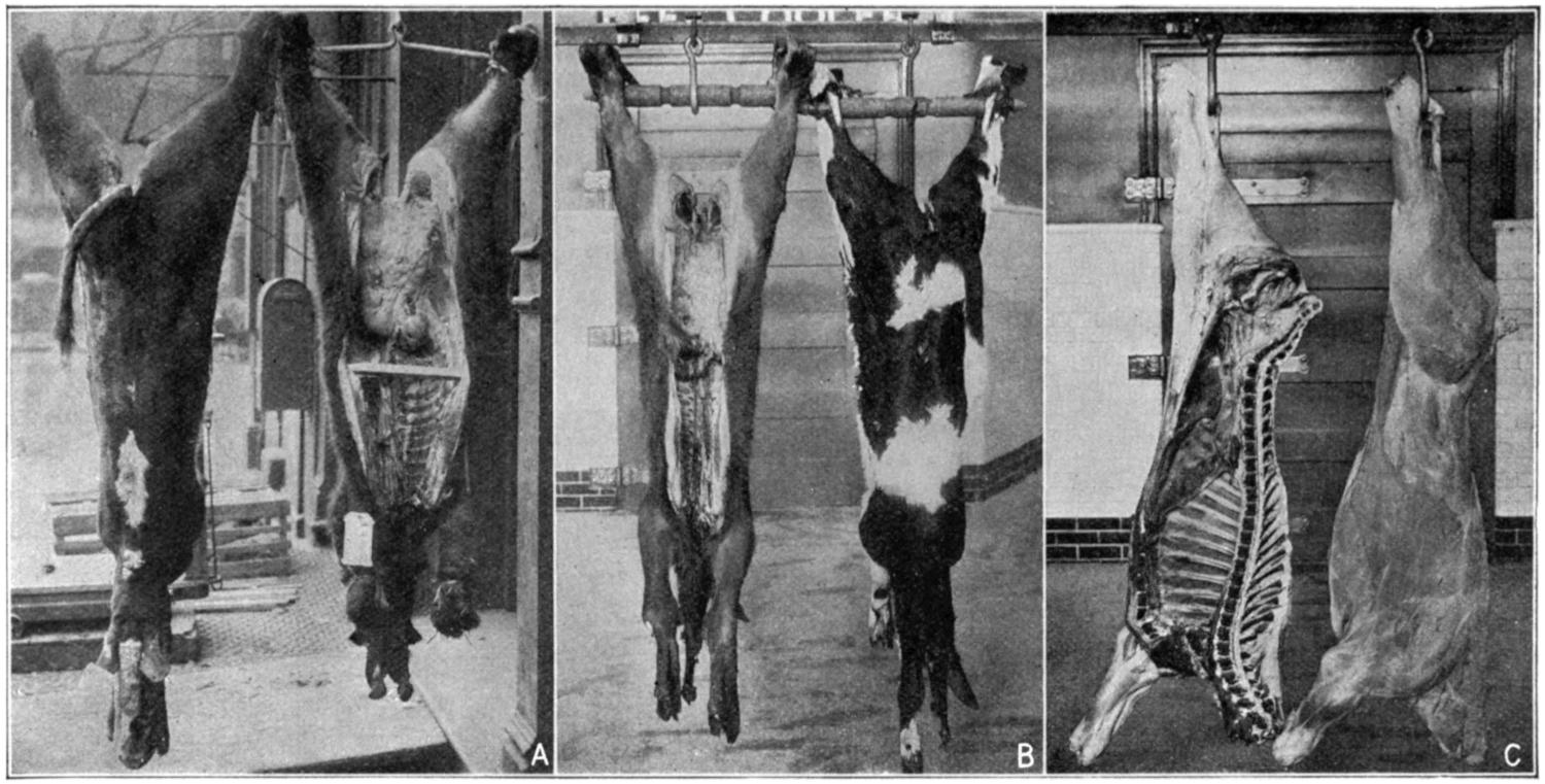 | Yields of Cattle — Yield from Twenty-two Native Cattle — Yield from Fifty-nine Texas Cattle — Yield from Twenty Heavy Cattle — Yield from Thirty-four Cattle — Percentage of Various Cuts — Beef Cuts — Diagram of Cutting — Grading — Loins — Ribs — Rounds — Chucks — Plates, Shanks and Flanks — Barreled Beef. | |