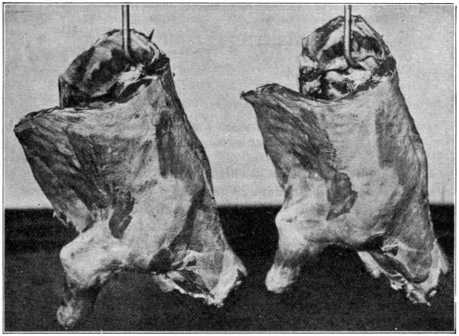 | Description of Beef Casings — Round Casings, How Made — Selection of Round Casings — Export Casings — Domestic Rounds — Beef Middles — Turning and Sliming — Inspection and Measuring — Beef Bungs — Bung Gut Skins — Beef Bladders — Beef Weasands — Packages — Salt — Cleanliness — Water Temperature — Machines for Casings — Hog Casings — Small Casings. | |