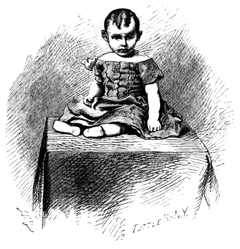 Perhaps you think it is a very simple thing to wash and dress little Effie. That shows how little you know. Now listen. That baby has four distinct little chins that you must watch your chance to wash between her frantic little crying-spells; then she has as many little rolls of fat on the back of the neck, that have to be searched out, and bathed; and all the time you are doing this you have to be talking little baby talk to her, to make her believe you are only playing, instead of washing her. Then baby won’t have her ears or 307nose meddled with; and if you interfere with her toes, she won’t put up with it a minute; and it takes two people to open her chubby little fists when it is time to wash them. Then you haven’t the least idea of the job it is to get one of her stiff little vexed arms out of her cambric sleeve; or how many times she kicks while you are tying on her tiny red shoe. Then she is just as mad as can be when you lay her over on her stomach to tie the strings of her frock; and she is still more mad if you lay her on her back. And besides, she can stiffen herself out, when she likes, so that “all the king’s men” couldn’t make her sit down, and at another time she will curl herself up in a circle, so that neither they nor anybody else could straighten her out; then you had better just count the garments that have to be got off and on before this washing and dressing business is done; and then every now and then you have to stop to see that she is not choking or strangling; or that you have not put any of her funny little legs or arms out of joint, or hurt her bobbing little head. Now, I hope you understand what a delicate job it is. But when the last string is tied, and little Effie comes 308out of this daily misery into scarlet-lipped, diamond-eyed peace, looking fresh and sweet as a rosebud, and dropping off to sleep in your arms, with quivering white eyelids and pretty murmurings of the little half-smiling lips, while the perfect little fat waxen hands lie idly by her side, ah—then you should see her!