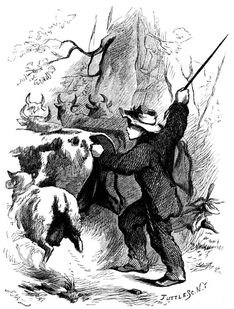 What Johnny liked above all things, was to be sent off by his father a great way though the wilderness, with droves of cattle; and when he was only twelve years old, he used to go with them more than a hundred miles. What do you think of that? He was quite proud of it himself, and nobody could have affronted him more than to offer to help him at such times. He was more like a little Indian than anything else; he could hear so quickly any sound a long way off; and he declared that he had often smelled the frying of doughnuts at five miles’ distance. Pretty good nose, hadn’t he?