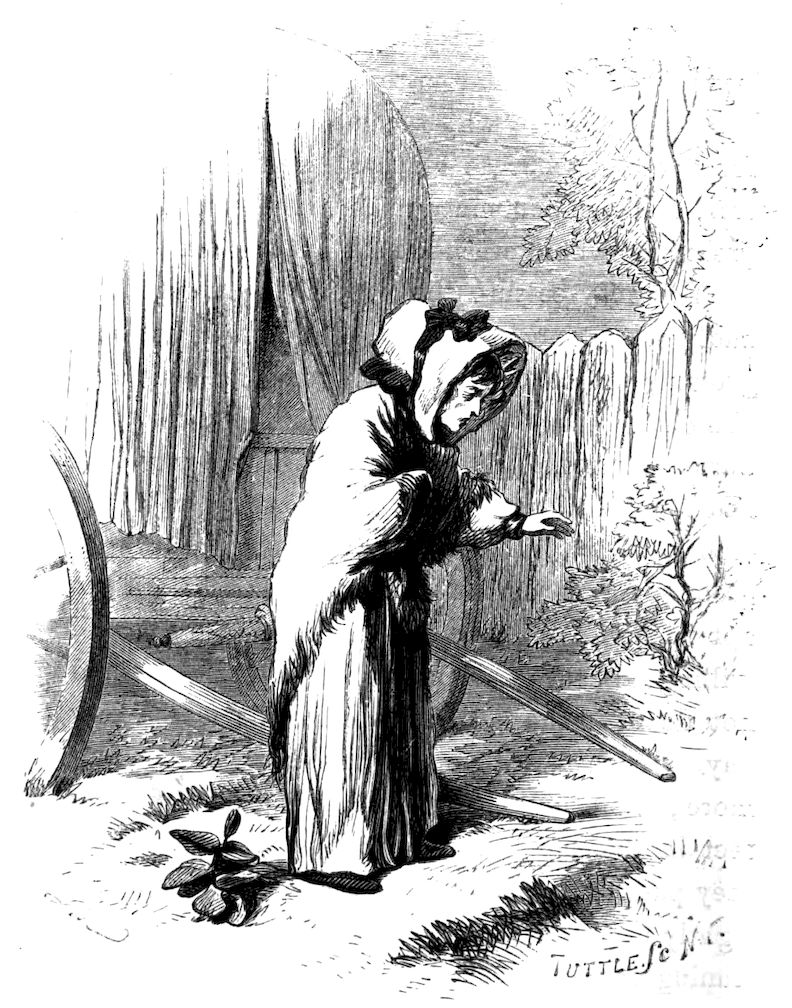 A part of every year my mother spent in the country. One summer, while I was yet a child, we were located in a very lovely spot near Boston. Connected with the church where my mother worshiped, was a female prayer meeting, held alternately at the houses of its different members. One warm summer afternoon, my mother passed through the garden where I was playing, and asked me if I would like to go too. I said yes, because I liked to walk with my mother anywhere; so we sauntered along the grassy path under the trees, till we came to a small, wooden house, half hidden by a tall hedge of lilacs. Then my mother led me through the low doorway, and up a pair of clean wooden stairs, into an old-fashioned raftered chamber, through whose open window the bees were humming in and out, and the scent of flowers, 14and song of birds, came pleasantly enough to my childish senses. Taking off my sunbonnet, and brushing back my curls, she seated me on a low stool at her feet, while one of the old ladies commenced reading the Bible aloud. All this time I was looking around curiously, as a child will, at the old-fashioned paper on the walls, with its pink shepherdesses and green dogs; at the old-fashioned fireplace, with its pitcher of asparagus branches, dotted with little red berries; at the high-post bedstead, with its rainbow-colored patchwork quilt, of all conceivable shapes and sizes; at its high-backed, stiff-looking chairs, with straw seats; at its china parrot on the mantel, and its framed sampler on the wall, with the inevitable tombstone and weeping willow, and afflicted female, handkerchief in hand.