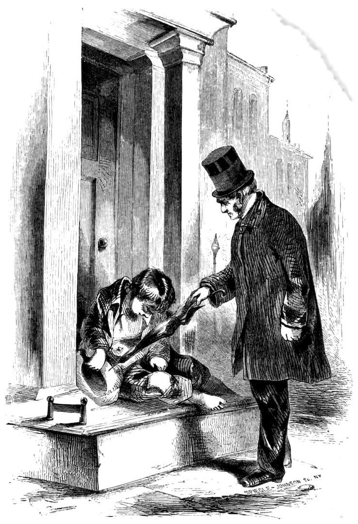 “But the policeman carried her off, still shrieking, and as her voice died away in the distance, I could still hear ‘Oh don’t! oh let me go!’ and then the crowd scattered, and every body went home; and I went back to bed, and dreamed that the little girl was going to be hung, and that I saved her. Not till the next morning, could I find out what was the cause of the trouble. The little girl’s name was Ann Mahon. Her father and mother were Irish, and lived in a cellar, with a great many people, black and white, who were all very bad and idle. Little Ann had never lived in any other way than this; she was born in a cellar; and had been beaten and starved and abused, till she was not more than half the size of children of her own age. Her father and mother were both drunkards; they were too idle to work for a living, so they sent poor little Ann out into the streets at nine o’clock at night, to beg money; thinking that people would pity a little girl so much for being all alone at that time of night, that they would certainly 245give her something. But to make sure of her getting it, they told little Ann, when they pinned the thin ragged dirty shawl over her little brown head, that if she sat down on the steps anywhere, and went to sleep, or did not bring some money when she came back, they would whip her, till she was almost dead. So the poor little thing went out, and pattered up and down the cold pavements, with her bare, weary feet, hour after hour, never daring to sit down a moment to rest herself, running up to the gentlemen who were hurrying home, with ‘A penny please sir? a penny please sir?’ Now, a lady would come along, a bright beautiful lady, with a gay cloak, just from the theater or opera, leaning on a gentleman’s arm, her eyes flashing like the diamonds in her bosom; she would hear little Ann’s ‘A penny please,’ as she stepped into her carriage, and gathering up her beautiful clothes in her snowy fingers, lest Ann should soil them, would turn away and pass on, and the gentleman with her, would say, ‘What a pest these beggars are.’ Sometimes some gentlemen who had little girls at home like Ann, would put their hands in their pockets, and give her a penny, and say kindly, ‘Run home, my dear, out of the street,’ but the poor child did not dare to go, till she had more pennies, and so she wandered on.