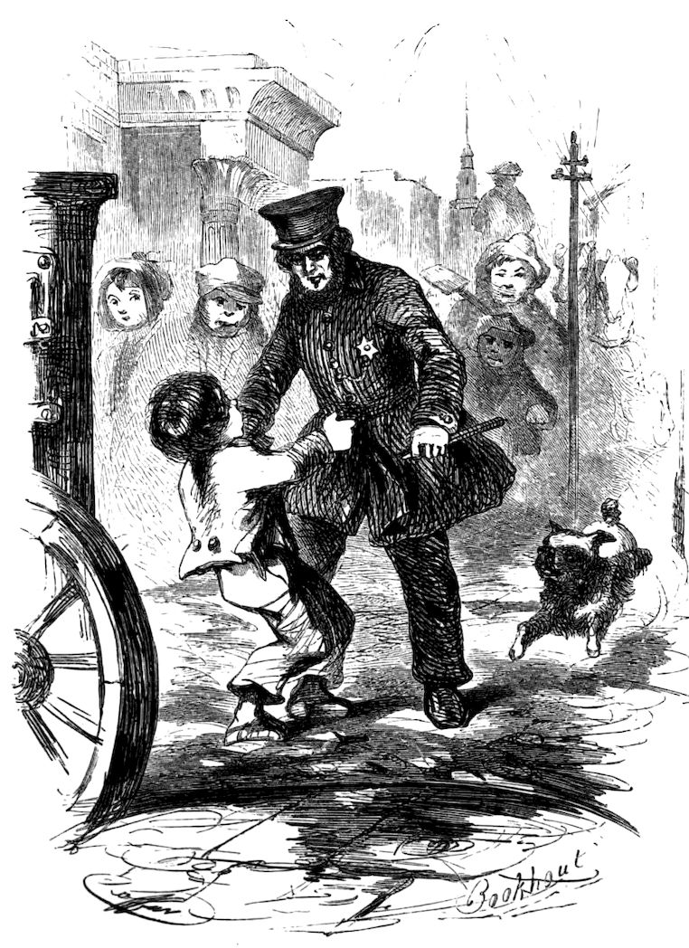 “Presently little Ann felt a heavy hand on her shoulder; she started, and turned round—there was a tall policeman! Little Ann screamed; she knew well enough what a policeman was—poor little girl, she had seen the bad people among whom she was forced to live, hide away from them, many a time; and she had seen them, when the policeman caught them, struggle, and kick, and scream, to keep from being carried to prison; no wonder that little Ann screamed out, ‘Oh, don’t—let me go—oh, don’t!’ as the policeman lifted her up in his arms, just as he would a feather, to carry her off, as she thought, to jail.