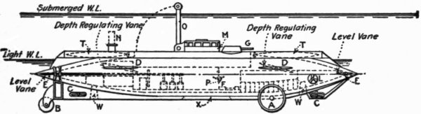 12 Mr. J. F. Waddington used vertical propellers in tubes through the vessel for keeping her on an even keel or submerging when stationary, on a small electric submarine he invented, built and demonstrated at Liverpool in 1886.