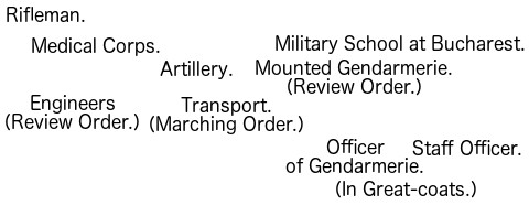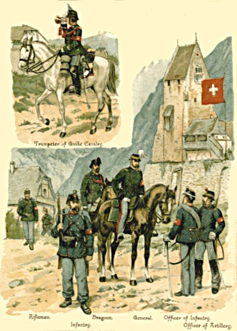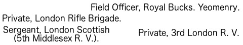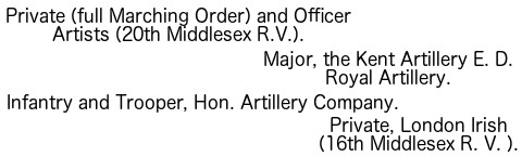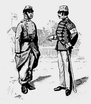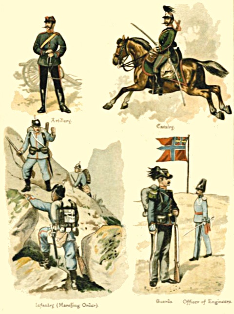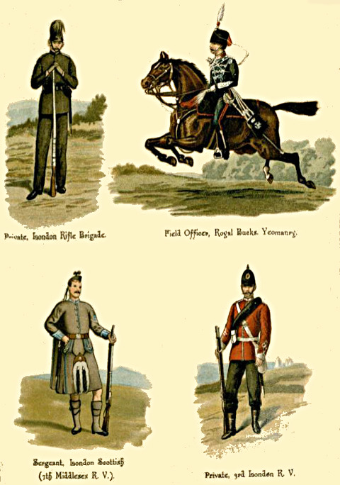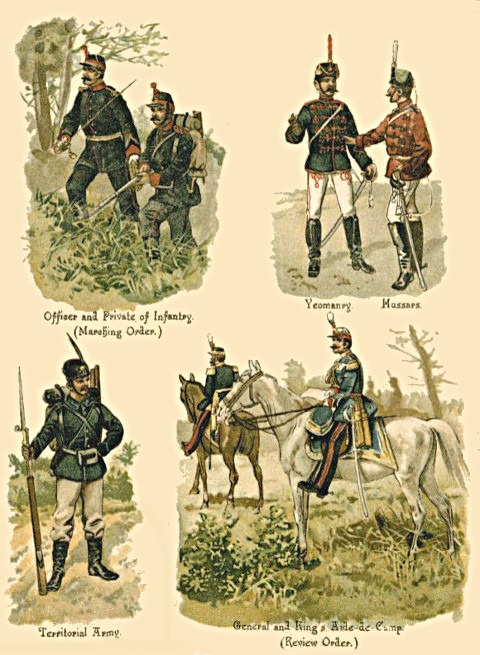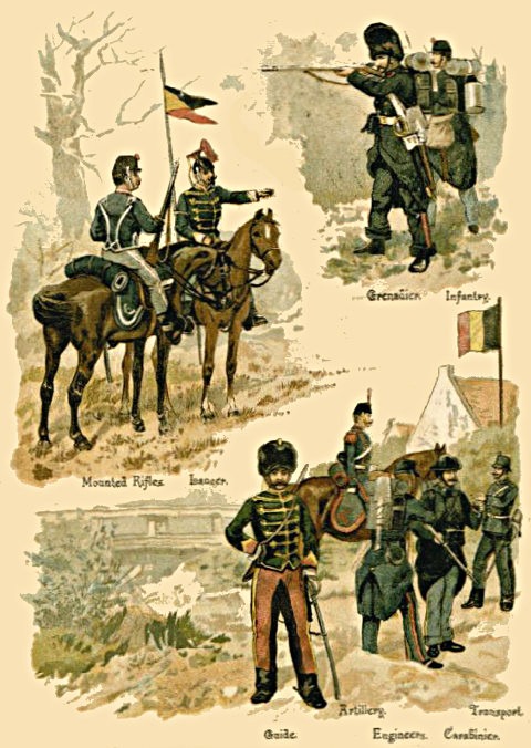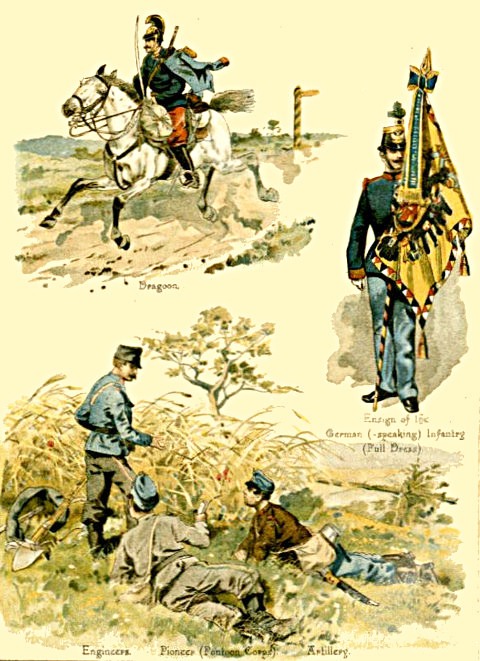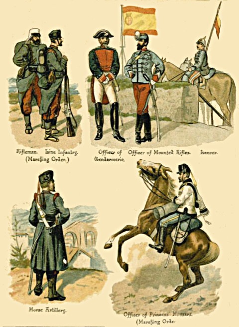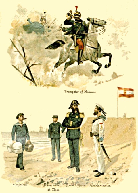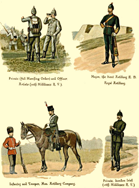 1. The Regular Army consists of Cavalry, Artillery, Engineers, and Infantry; besides these are the non-combatant branches, [Pg 5] consisting of the Army Service Corps, the Ordnance Store Corps, the Medical Staff Corps, the Pay, Medical, Chaplains, and Veterinary Departments, and a few more.