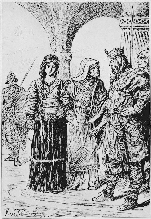 “The Emperor’s charming wife, Lindgard, enters the courtyard followed by a numerous train. Her cheeks vie in tint and glitter with the roses, and her hair with the shimmer of a purple robe. Her brow is bound with a purple fillet, jewels sparkle on her neck, and a golden crown glitters on her head. As she enters with her ladies, courtiers make way to her, right and left. She mounts her horse, which is brought to her, and beams with royal dignity upon the crowd of nobles surrounding her two sons, Carl and Pepin. The one who bears his father’s name resembles him in figure, countenance, and spirit. He is in full armor—a valiant warrior, tried and true. Following the queen and princes, the hunters crowd through the gates accompanied by a tumult of sound from hound bells and horns. Next appear the princesses with their retinue. Rotrud rides at their head, calm of face and proud in bearing. Her blonde hair is fastened by a purple band, and a little gold crown gleams upon her brow. Next, Bertha, the image of her father in face, voice, and disposition. Her blonde hair is intertwined with gold cords and wreathed with a diadem. A marten-skin covers her snowy neck, and the seams of her tightly fitting cloak are set with glittering jewels. Next rides Gisela, dazzlingly white and beautiful. Purple threads are interwoven in the delicate texture of her veil. Silvern gleam her hands, golden her brows, her eyes shine like the sun, and she manages her fiery steed with perfect ease. Ruodhaid on her gracefully ambling palfrey follows. Hair, neck, and feet glow with jewelled ornaments, and a silken mantle, fastened at the breast with gold clasps, covers her shoulders. Then follows Theodora, she of the rosy face and gold-red hair, wearing a necklace of emeralds and a gorgeous mantle. Hiltrud, last of the sisters, appears and, after glancing around majestically, turns her steed in the direction of the forest whose dark recesses invite this imposing expedition.”