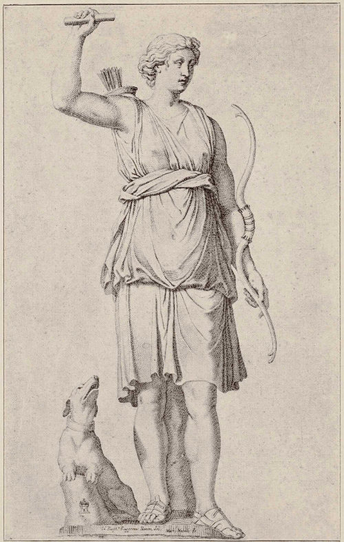 After Actæon had thus wretchedly perished, his hounds began to miss their loved master. Baying and whining, they sought the lost one everywhere, until at last they came to Chiron’s cavern. Chiron made a bronze image of Actæon so much like him that it deceived them. When the hounds saw it they sprang upon it, licked the hands and feet, and acted as joyfully as if they had found their real master again.