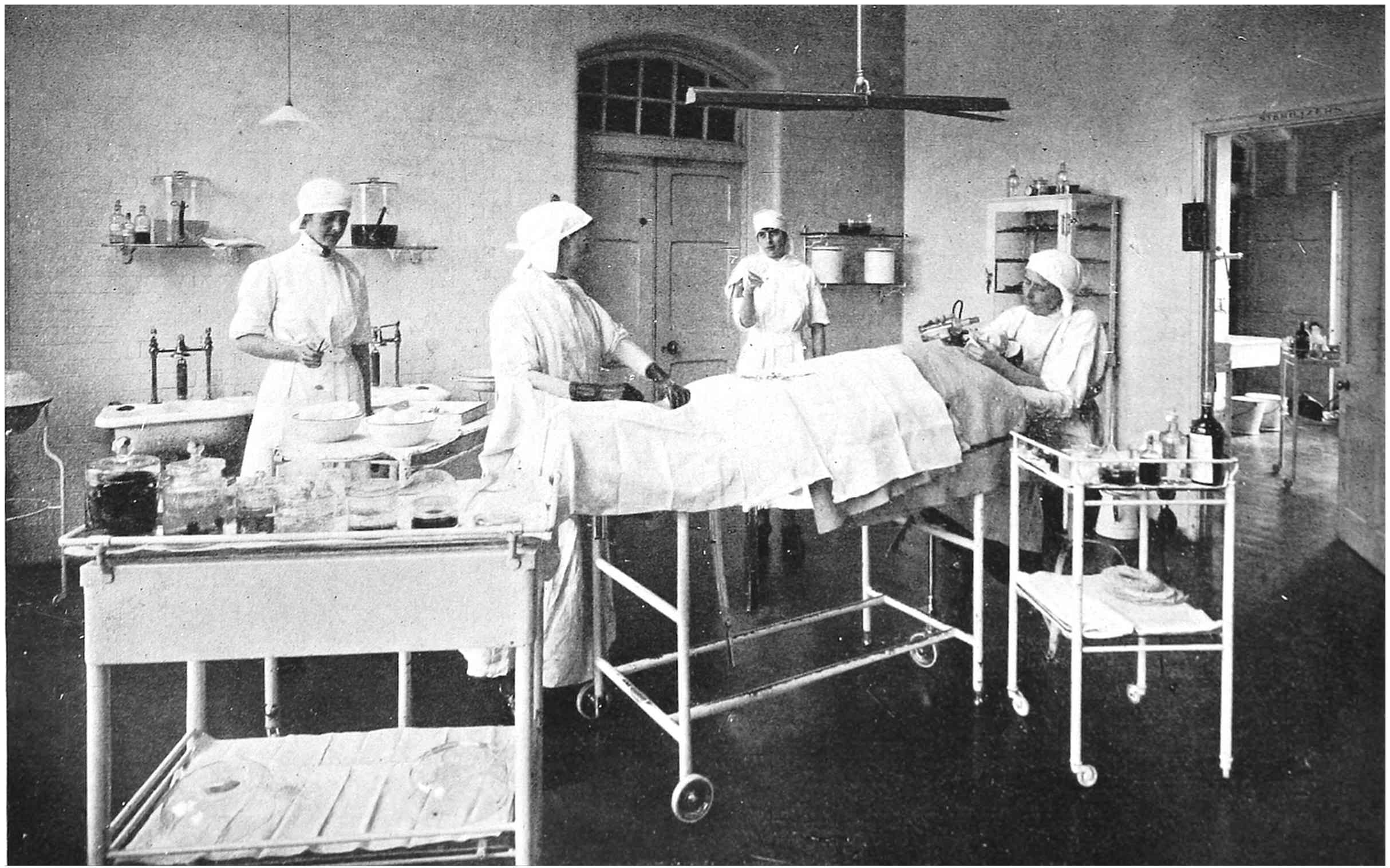 During the vacation, students from the London School of Medicine for Women came in large numbers to work in the wards and laboratories and operating theatre. Teachers from the women’s colleges at Oxford and Cambridge and from girls’ schools gave up a month or a fortnight of their hard-earned rest to relieve the hospital orderlies. Older girls came by tens from Roedean School for girls to take up administrative or clerical work or to be general duties orderlies. Wycombe Abbey sent its contingent, and friends and251 younger sisters volunteered to help also. The scheme was a great success: the regular orderlies appreciated the good holiday and came back better for it, and the substitutes enjoyed the novelty of the work and surroundings, and learnt much that was useful to themselves. Sunburnt, muscular schoolgirls appeared to find great pleasure in conveying stores and linen about the hospital, and their good spirits were a delightful asset. They took an interest too, in the personnel and customs of the hospital, and were wont to carry on conversations about them in loud tones, which were very amusing to those who could not help overhearing them.