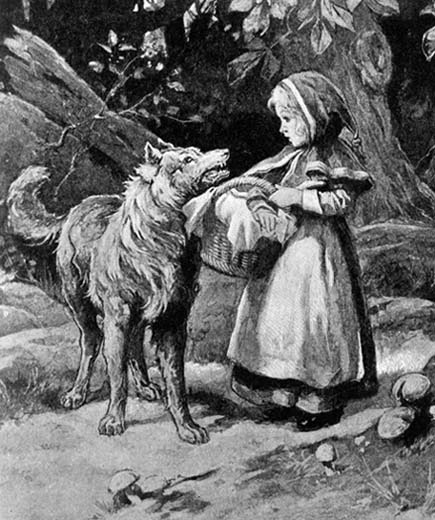 Little Red Riding-Hood. Oh! how you frightened me, Mister Wolf! Where did you come from?