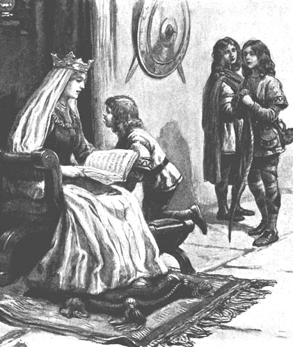 Spirit. Fair Sabrina, for this aid I pray that all the pretty rills will never cease to flow into your broad river. May your banks ever be fair with groves and meadows sweet, while all men shall praise you for your gentle deeds. Farewell. Now, Lady, let us hasten from this grove. Your parents await their dear children, and we must hasten ere they become alarmed over your delay. Thanks to your pure heart and the aid of the fair Sabrina, you have come safely through the enchanter's wood.