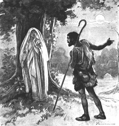 I believe some maiden approaches. I will weave my spells and appear to her in the dress of a shepherd and she will not be afraid. Here she comes. I will step aside and learn how she happens to be alone in my grove.