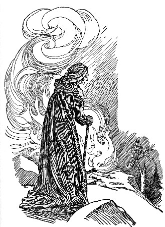 When morning came, the two hunters were still watching the sky. Little by little they saw that there was a high mountain in the west where the light had been, and above the mountain floated a dark blue smoke. "Come," said one, "we will go and see what it is."