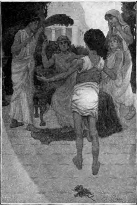 The stranger had forcibly relaxed the clutch of the bony fingers. “Here is thy money,” he said, counting out from his broad palm the coins which the child passed over to him with a look of piteous appeal. “Five denarii, saidst thou. As for the lad, if he hath the proper love for thee he will doubtless return fast [pg 22]enough when thou art in kindlier temper; if not, thou art relieved of his keep. Come with me, boy, if thou wouldst eat.”