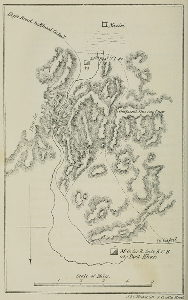The first of two maps precedes the Introduction. It lacks a caption but probably depicts the Kabul or Khood Cabul Pass. "Boot Khak" named on the map is probably the "Bhoodkhak" of the Journal.
