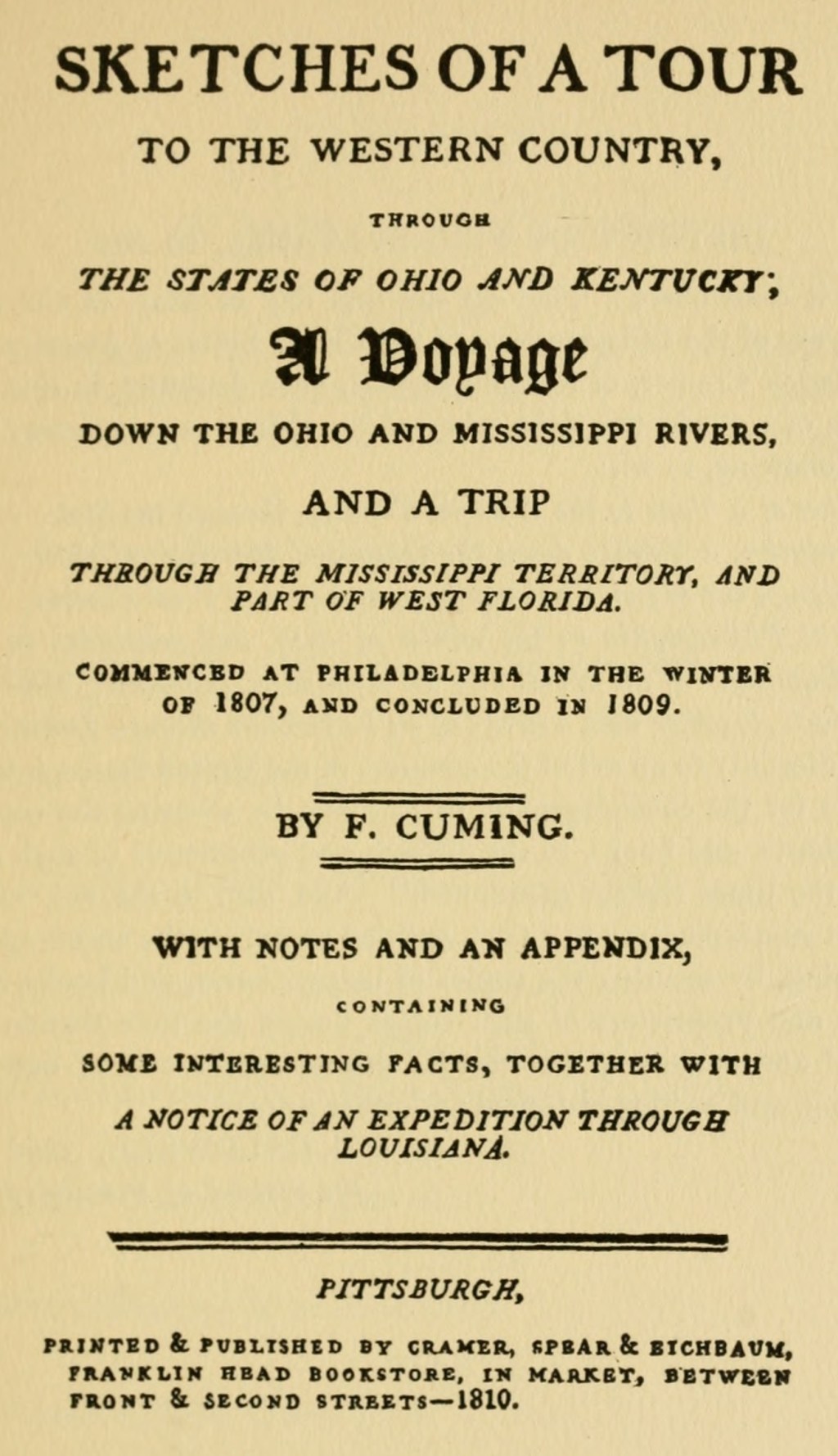 Sketches of a Tour to the Western Country, through the States of Ohio and Kentucky; a Voyage down the Ohio and Mississippi rivers, and a Trip through the Mississippi territory, and part of West Florida. Commenced at Philadelphia in the winter of 1807, and concluded in 1809. By F. Cuming. With Notes and an Appendix, containing some interesting Facts, together with a notice of an Expedition through Louisiana.