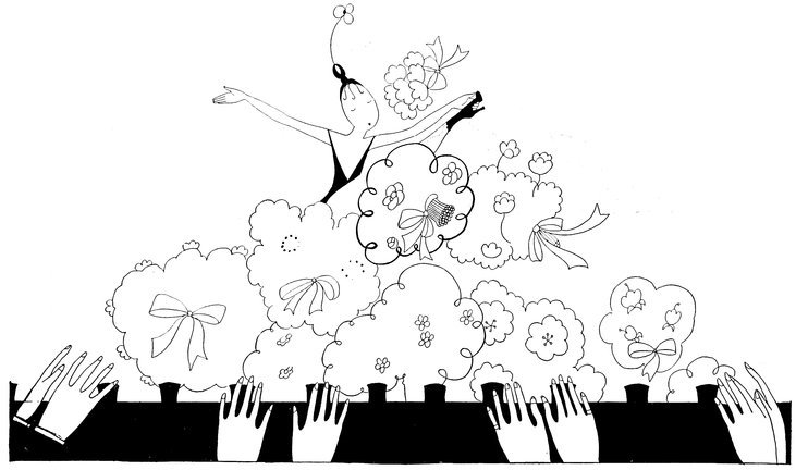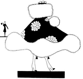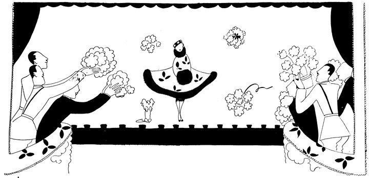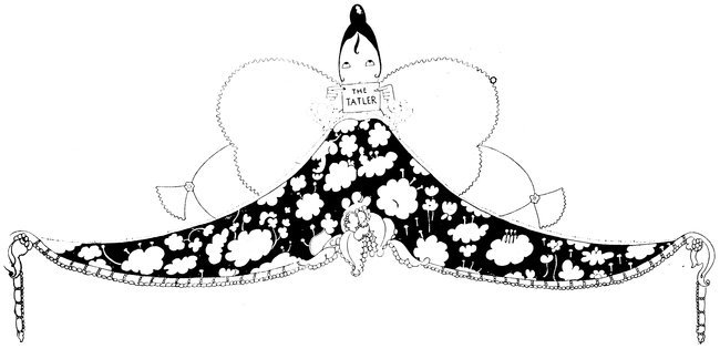 The successful invasion of the London stage by American artistes induces Eve to abandon her habitual reserve and appear (for charity) in a revue especially written for her by Sir Peter Pan. In order to avoid shocking the susceptibilities of the “past smart set,” who are these war times very early-Victorian, she has depicted herself at the moment when her scarcity of costume was obliterated by the mass of floral tributes hurled by an enraptured audience