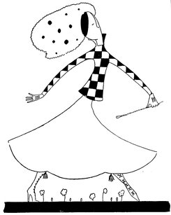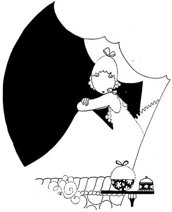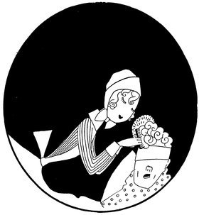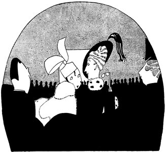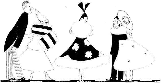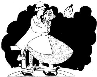 But in judging these fascinating drawings merely from the point of view of their humour and charm, one is apt to overlook the fact that Eve—while possessing a style which is unique—is also, and at the same time, a designer of remarkable gifts. It is, perhaps, as a designer that she will appeal most greatly to an artist. Each of her drawings is an exquisite example of this gift for design. Their line, their “proportion,” as it were, and the clever use she makes of black—big splashes of black—all help to make her drawings exquisite little pictures—“pictures” in the popular sense—as well as wonderful examples of technique and imagination. Another thing about all her drawings is their feminine daintiness. Each design is as dainty as the heroine who appears in nearly all of them. With a few strokes, a dot here and there, a line, she can suddenly bring before our eyes a perfectly-recognisable type. In this way her gifts are superior even to Phil May, who surely, more than many artists, obtained his effects with the least number of unessentials.