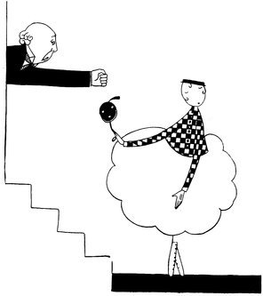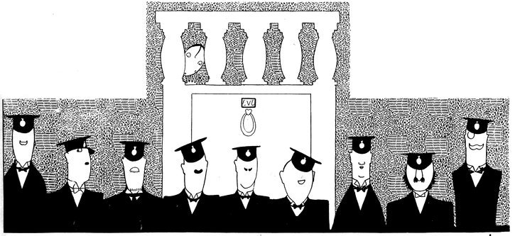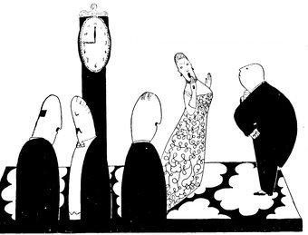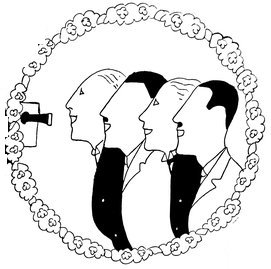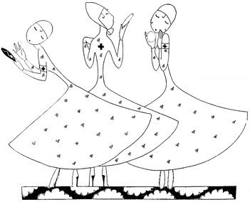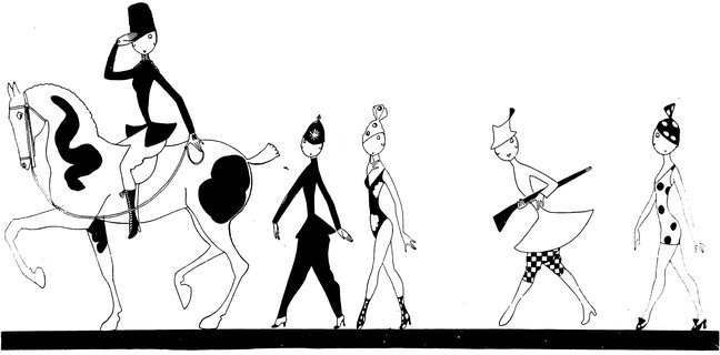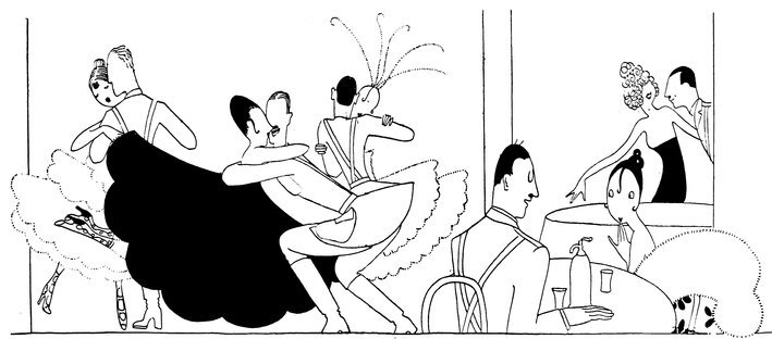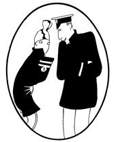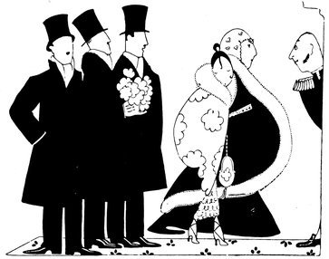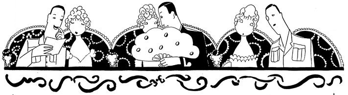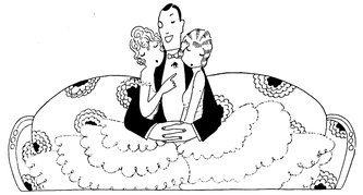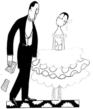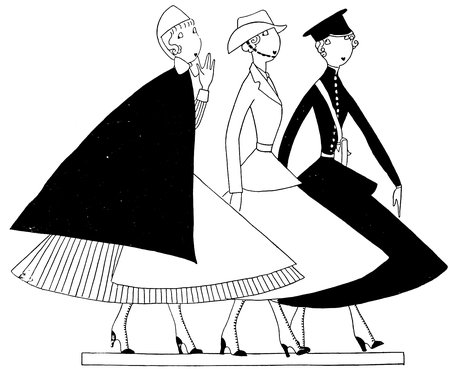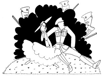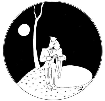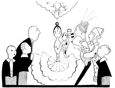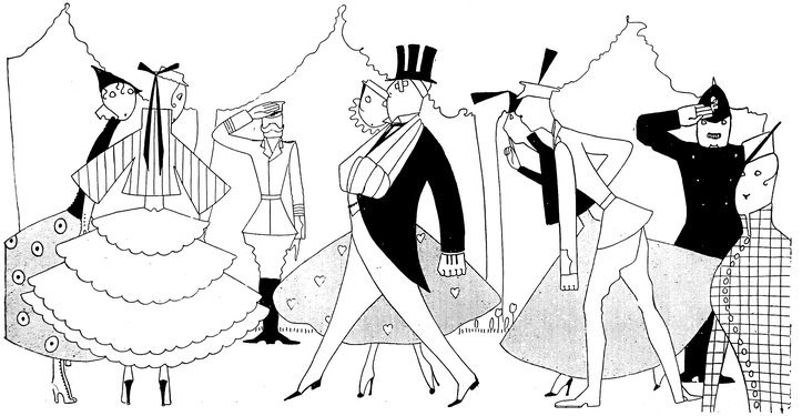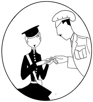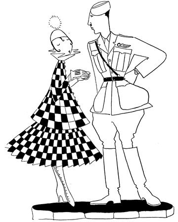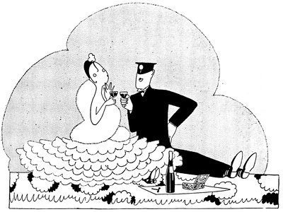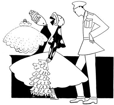 The classical picture on the left represents the pre-war Adam taking a demure Eve away from her watchdog for a graceful waltz. On the right you see the modern, cheerful, and unchaperoned conditions. (The Adams and Reggies don’t really dance in uniforms and spurs, but Eve likes drawing them like that)