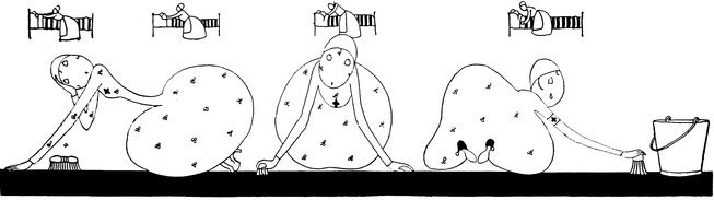 When Eve, Evelyn, and Evelinda arrived at their destination they were promptly set to work scrubbing the floors and washing the dishes, while less ornamental but considerably more useful workers attended to the dear soldiers. Eve, Evelyn, and Evelinda, if disappointed, were full of patriotism, so they worked—and worked—