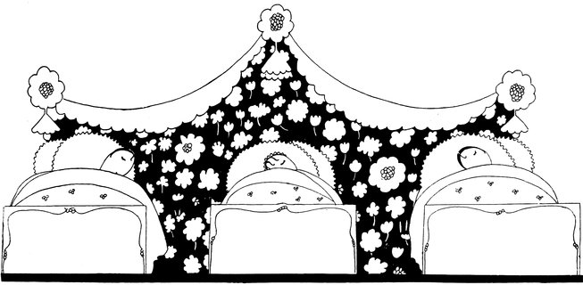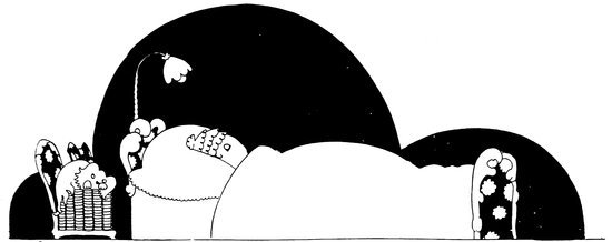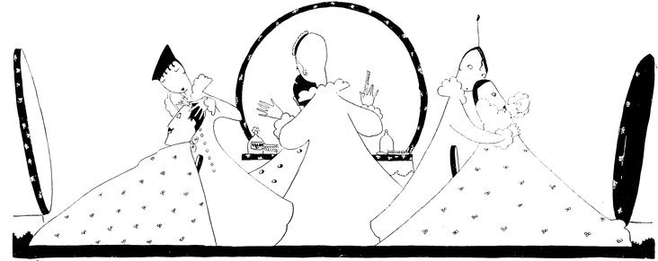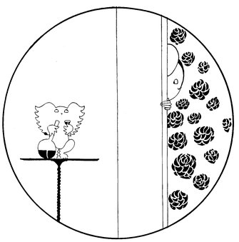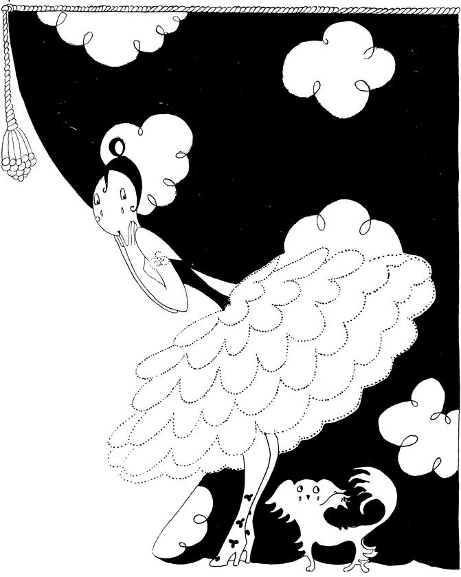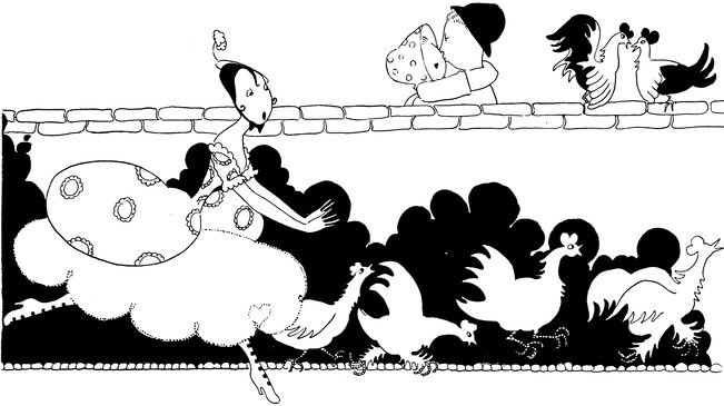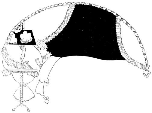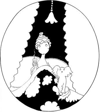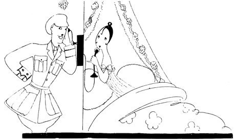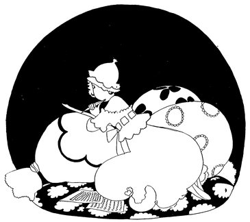 Here we have a vivid picture of Eve, hamper packed and ready (Tou-Tou on guard), keeping one eye open for the alarm. A considerable clamour awakens her, so—