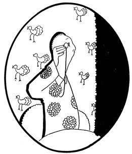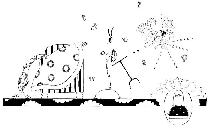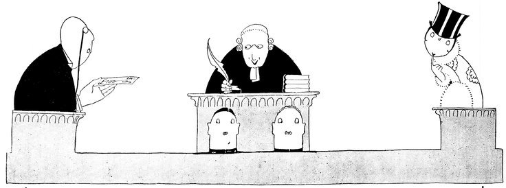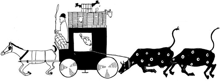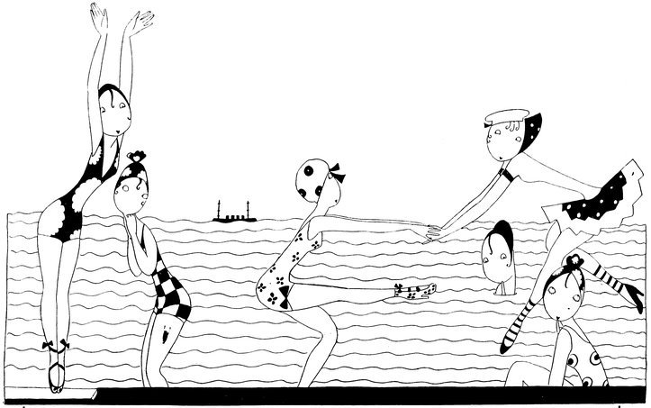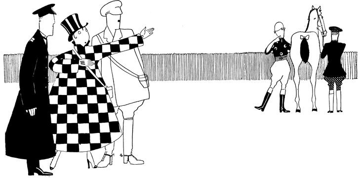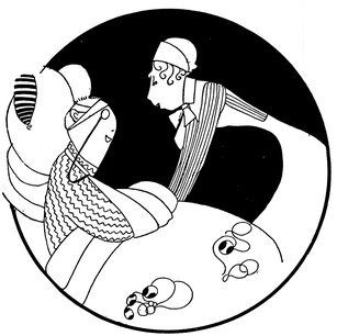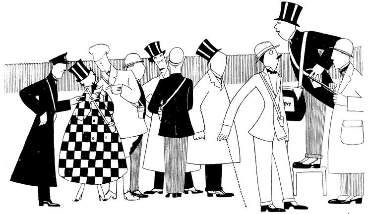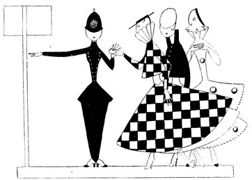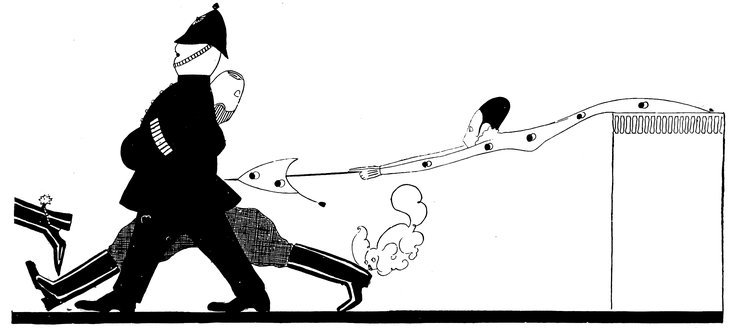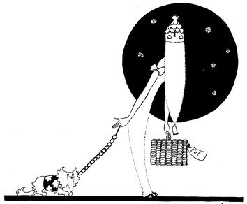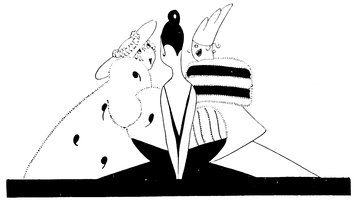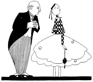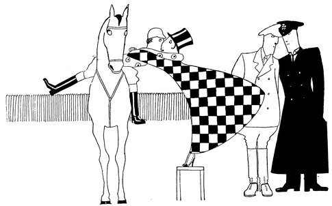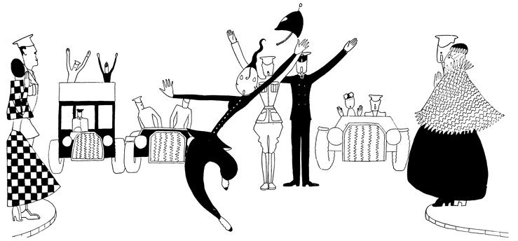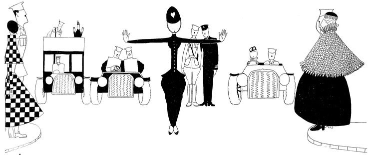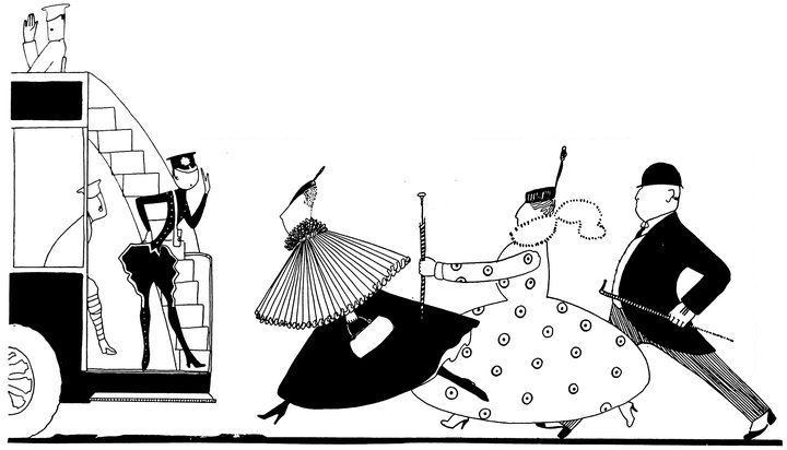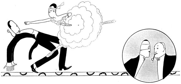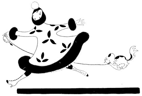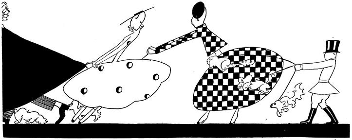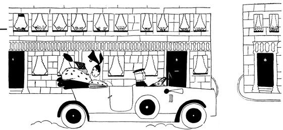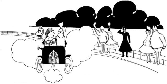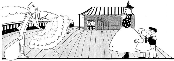 Moreover, Eve never draws what I must call a “dead” figure. Everyone—everything, almost—is alive. Her animals—burlesques of animals though they be—are full of character and fun. Even such things as motor-cars, ships, and carriages—which, from the point of view of an artist painting nothing but the truth, are out of all proportion—possess a quaintness which somehow accords better with the picture than if they were perfect models of technical knowledge and drawing.