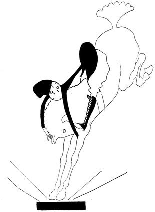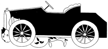 However, all troubles come eventually to an end, and Adam, poor dear, just back from the trenches, learns at last what real fear means. The fat rolling lines at the bottom of the picture are supposed to represent the dust which kindly Nature raised to hide the casualties in Eve’s wake, but in reality they were put in to hide Eve’s weakness in drawing car wheels