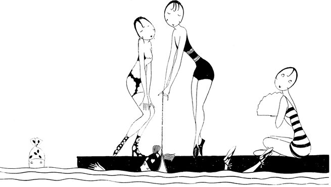 This is not the frivolous picture it appears, but represents little Eves in training for E.C.D.C. (Eve’s Coastal Defence Corps). Of course, the first thing to do is to learn to swim. Eve cannot tell us where this is taking place, as it would give away the (amatory) disposition of the Grand Fleet, which anchored dangerously close in soon after operations commenced