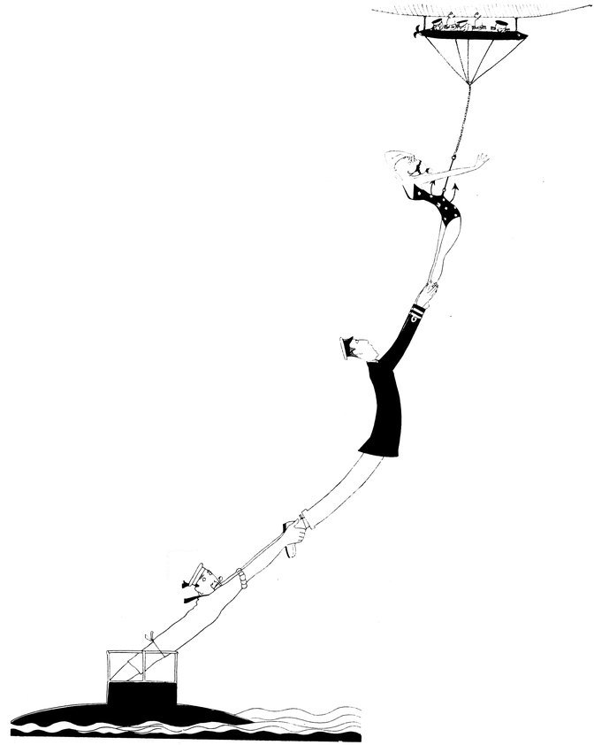 The bold and wicked air-pirates grappled Eve as planned, but (hooray for the Navy!) the gallant officer on the conning tower was able to seize her shapely limbs as she drifted over him, and, with the help of his equally gallant crew, effected a rescue at the expense of Eve’s already diminutive bathing creation—