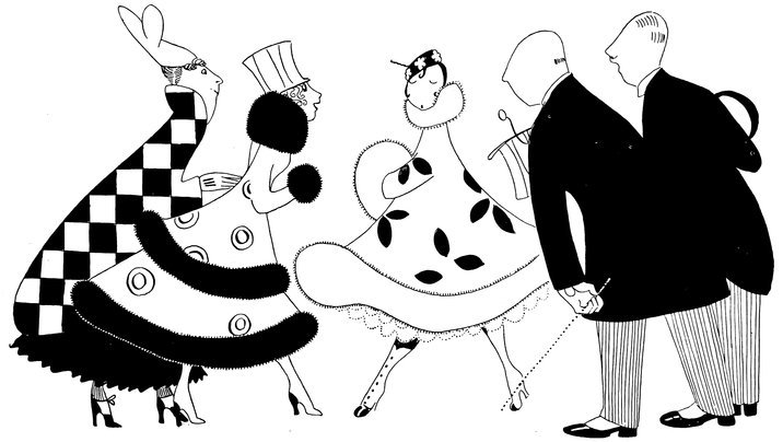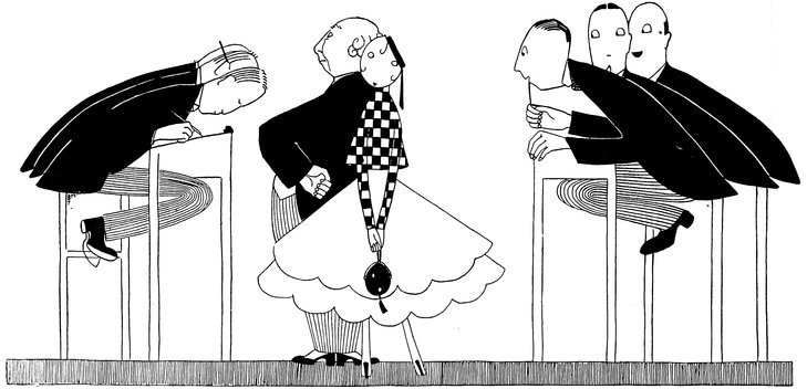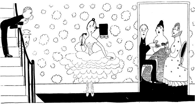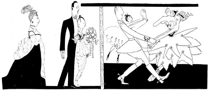 The arrival at “the ball” in the old days. Haughty wall-propping men, and little Eves wondering whether they were going to get off and detach one of the aforesaid males from his customary support, or also decorate the side benches—