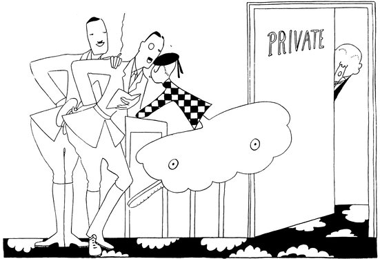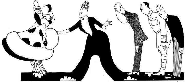 Few artists, however, have more quickly sprung into world-wide popularity than “Eve.” How great this popularity is may be judged by the numerous imitators which, while they copy many of Eve’s mannerisms, lose all that humour and spirit which make of Eve’s art such a fascinating and irresistible thing. For Eve possesses a gift which cannot be imitated, no matter how clever the artist who imitates her may be. Each person’s sense of humour—or lack of it—belongs to them alone. And it is Eve’s humour which make her delightful drawings so appealing. She has that sense of the “absurd” which is one of the rarest senses in all black-and-white art. And yet, while her irresistible humour makes one laugh, while her drawings fascinate us by their quaintness, she is never so far removed from reality as to be merely a painter of the human grotesque. Therein lies so much of her genius. She paints humanity with the eye of one who can see the comic in everyday people and things, and yet she never lets her feeling for the ridiculous obliterate her feeling for Truth. It is to be regretted that the clever letters which these drawings originally illustrated in “The Tatler” cannot be reproduced on account of their topicality.
