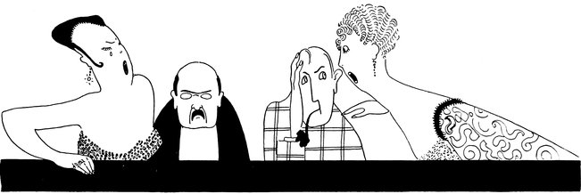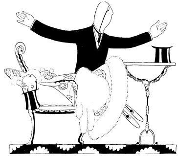 Anyway, here are Eve and uncle entrenched under the dining-room table. Eve is saying, “Are your teeth chattering, dear?” which is annoying uncle, for, as Eve well knows, they are up in the glass on his dressing-table