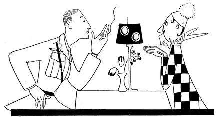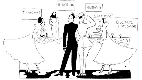 —so, with a view to keeping some of the new officers up to old form, they start a beauty barber’s shop for the blue and khaki—