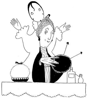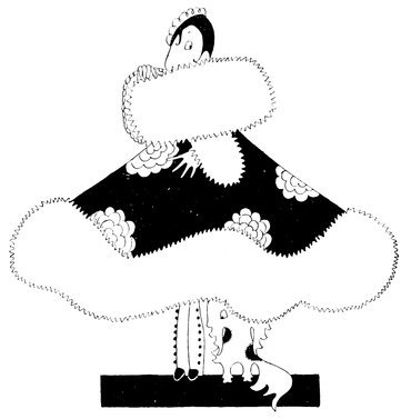 Eve is a great admirer of the new voluminous high-collared fur cloak, but finds it impossible to see—much less appreciate—the dinky tassels on her new boots