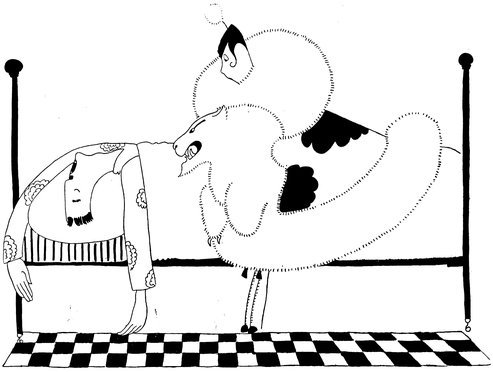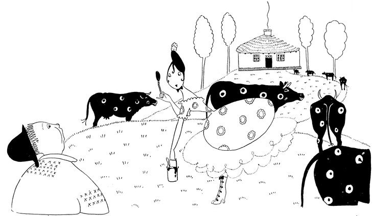 Eve’s artistic sense is deeply offended by the bizarre, not to say early-Victorian, markings of the cows; however, a judicious application of paints transformed them into ornamental as well as useful members of the community. Farmer Giles’s hair is, you will observe, rising in horror and pushing his hat of his head. (Eve can’t draw cows’ legs; hasn’t she got out of it cleverly?)