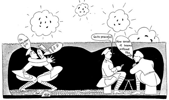 This is how trench life appeals to them respectively. The married men are on the right. (We must explain that the bachelor warriors on the left are not petrified with terror, but only agitated in thinking of the dear girls they left behind)