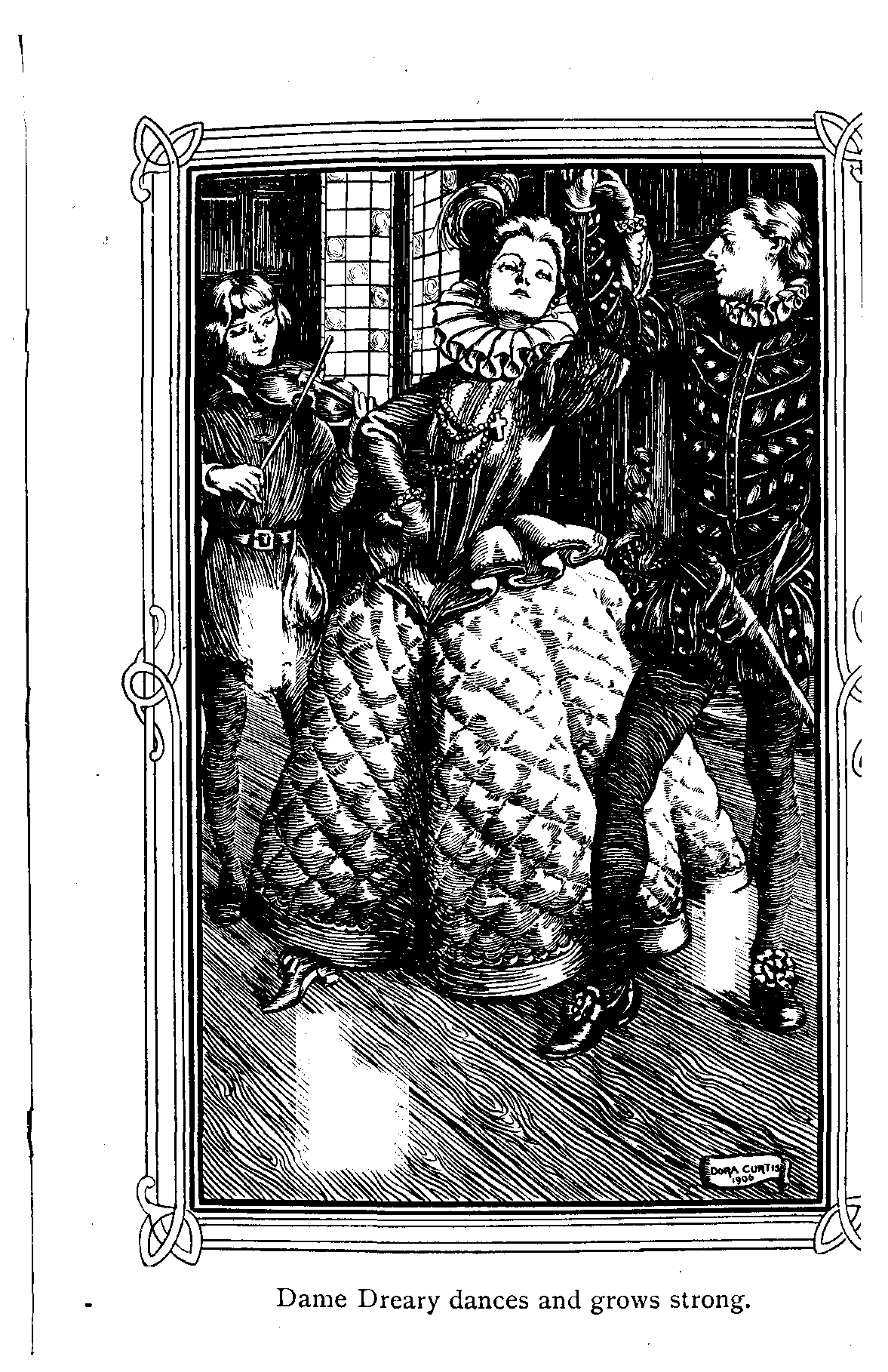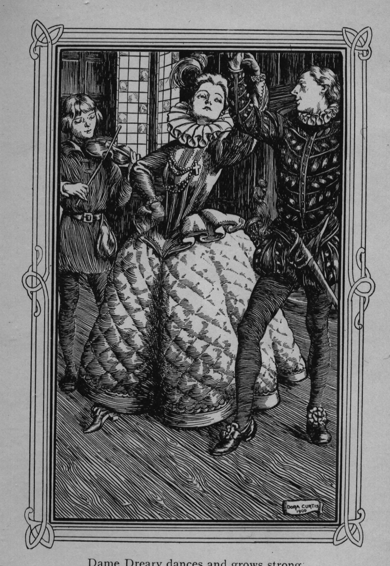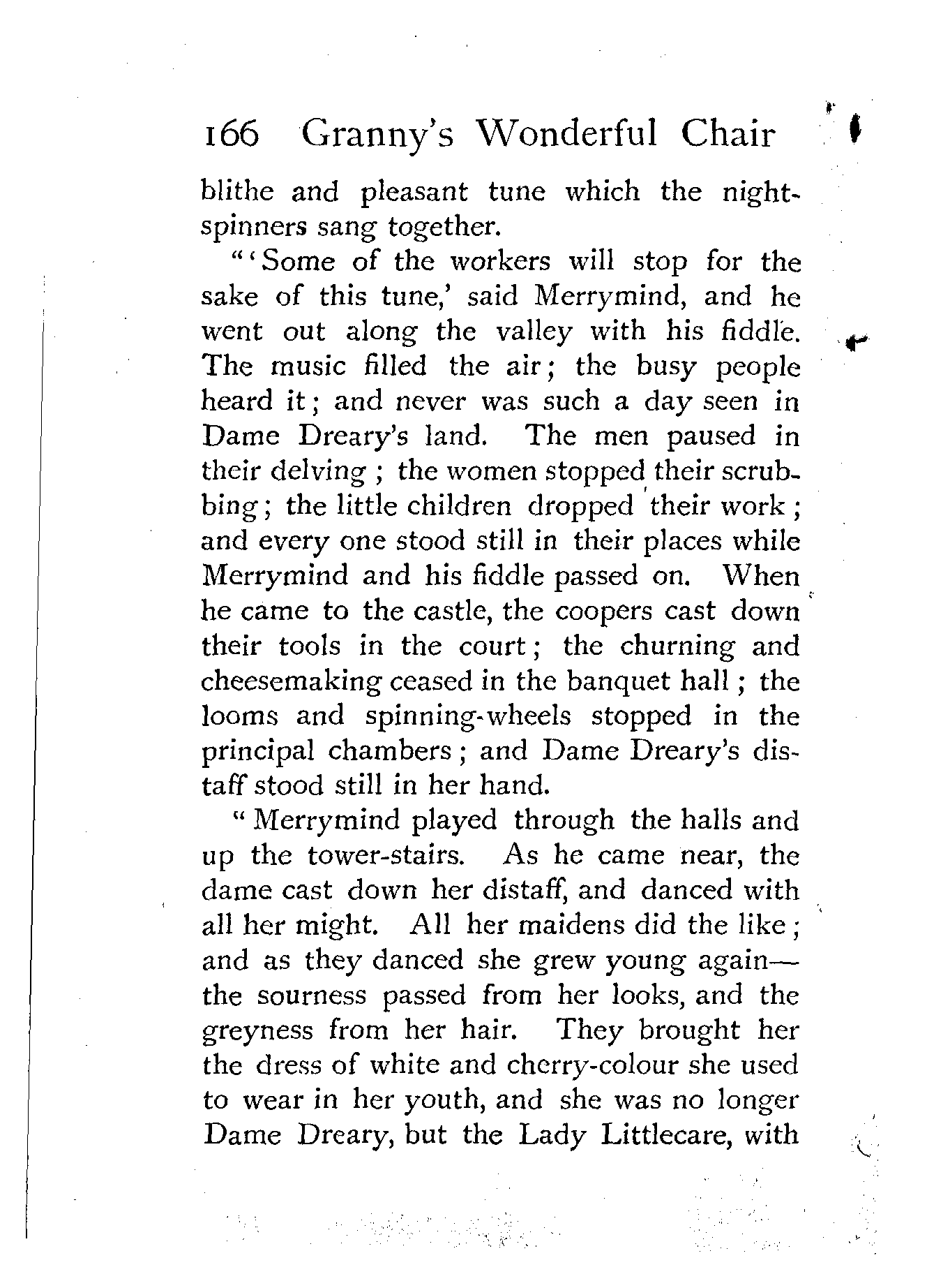 "Merrymind played through the halls and up the tower-stairs. As he came near, the dame cast down her distaff, and danced with all her might. All her maidens did the like; and as they danced she grew young again—the sourness passed from her looks, and the greyness from her hair. They brought her the dress of white and cherry-colour she used to wear in her youth, and she was no longer Dame Dreary, but the Lady Littlecare, with