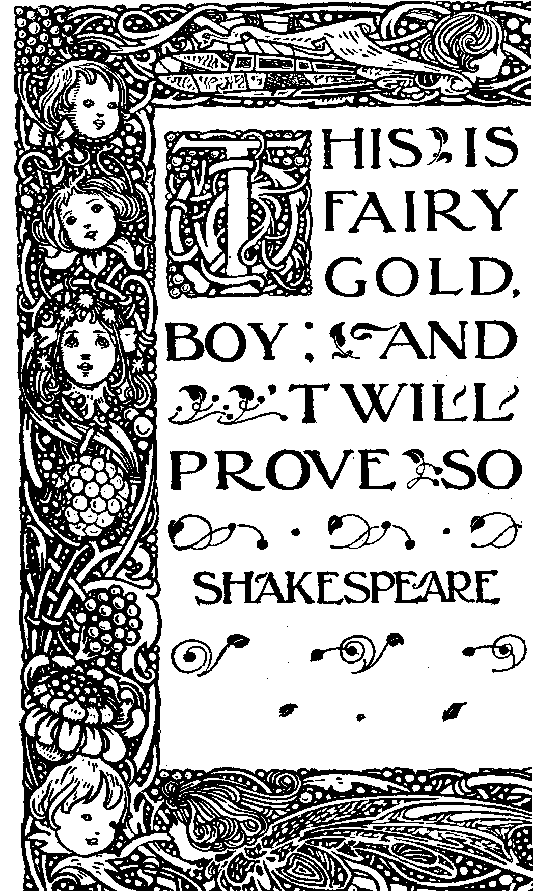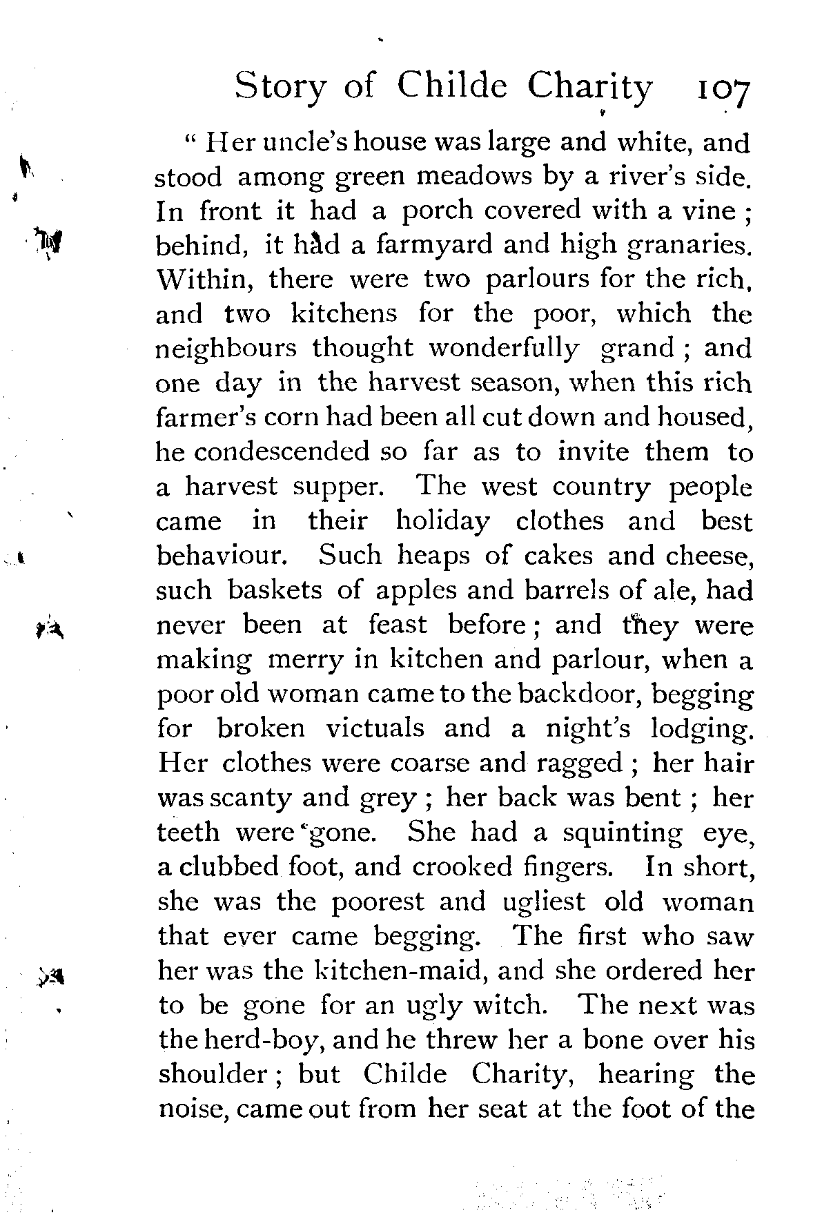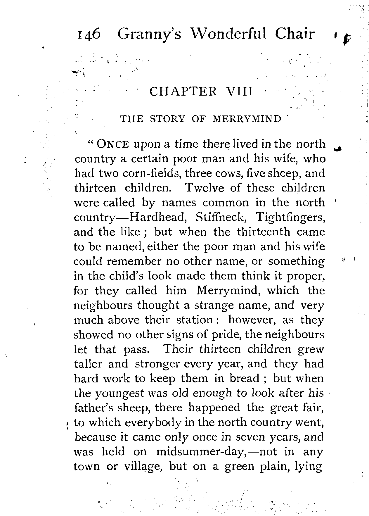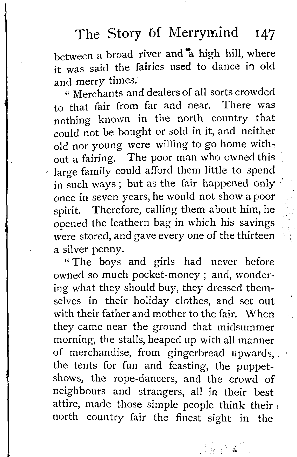 "Once upon a time there lived in the north country a certain poor man and his wife, who had two corn-fields, three cows, five sheep, and thirteen children. Twelve of these children were called by names common in the north country—Hardhead, Stiffneck, Tightfingers, and the like; but when the thirteenth came to be named, either the poor man and his wife could remember no other name, or something in the child's look made them think it proper, for they called him Merrymind, which the neighbours thought a strange name, and very much above their station: however, as they showed no other signs of pride, the neighbours let that pass. Their thirteen children grew taller and stronger every year, and they had hard work to keep them in bread; but when the youngest was old enough to look after his father's sheep, there happened the great fair, to which everybody in the north country went, because it came only once in seven years, and was held on midsummer-day,—not in any town or village, but on a green plain, lying [Pg 147]between a broad river and a high hill, where it was said the fairies used to dance in old and merry times.