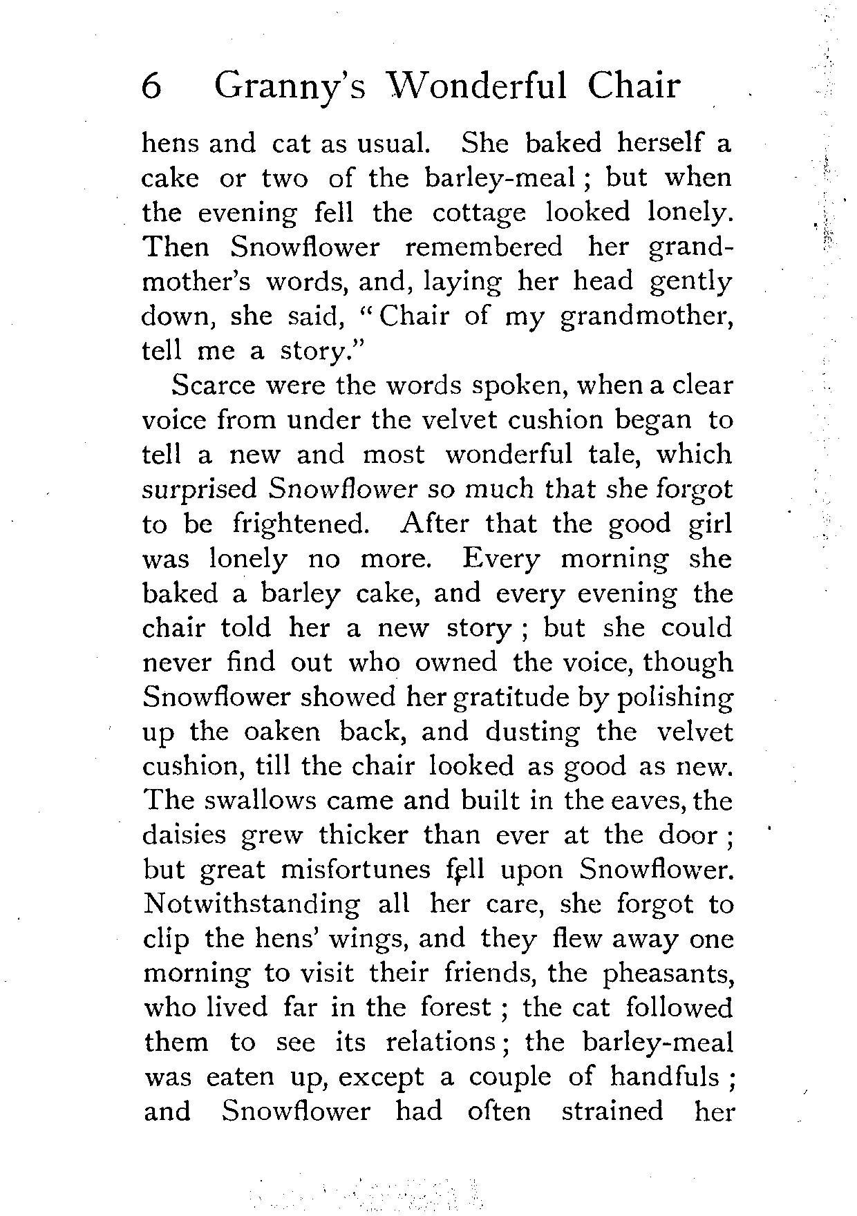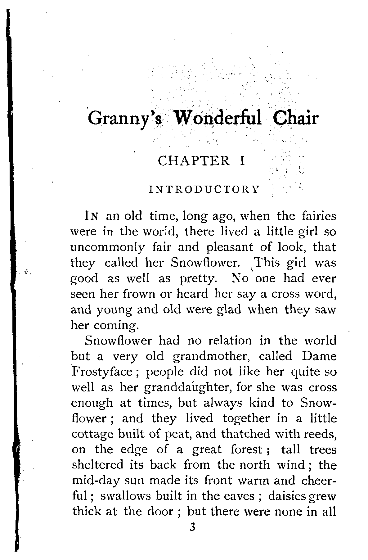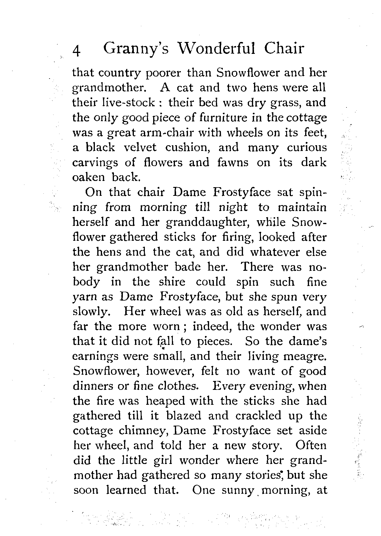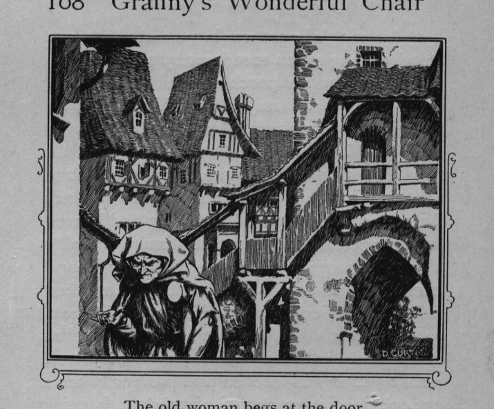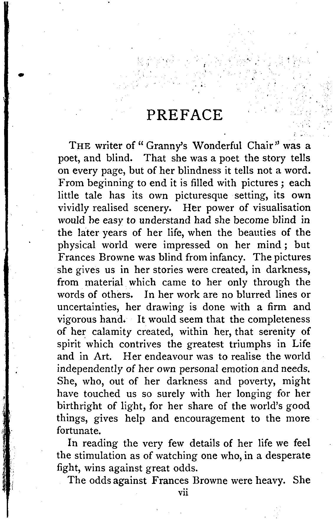 The writer of "Granny's Wonderful Chair" was a poet, and blind. That she was a poet the story tells on every page, but of her blindness it tells not a word. From beginning to end it is filled with pictures; each little tale has its own picturesque setting, its own vividly realised scenery. Her power of visualisation would be easy to understand had she become blind in the later years of her life, when the beauties of the physical world were impressed on her mind; but Frances Browne was blind from infancy. The pictures she gives us in her stories were created, in darkness, from material which came to her only through the words of others. In her work are no blurred lines or uncertainties, her drawing is done with a firm and vigorous hand. It would seem that the completeness of her calamity created, within her, that serenity of spirit which contrives the greatest triumphs in Life and in Art. Her endeavour was to realise the world independently of her own personal emotion and needs. She, who, out of her darkness and poverty, might have touched us so surely with her longing for her birthright of light, for her share of the world's good things, gives help and encouragement to the more fortunate.