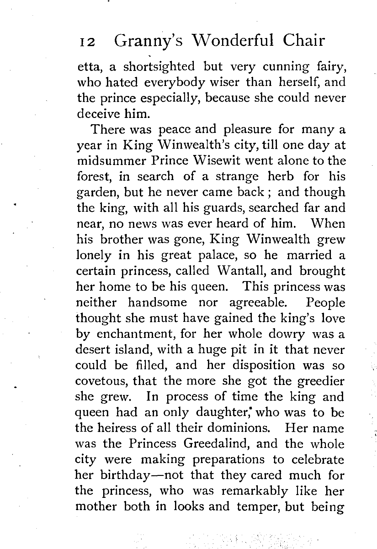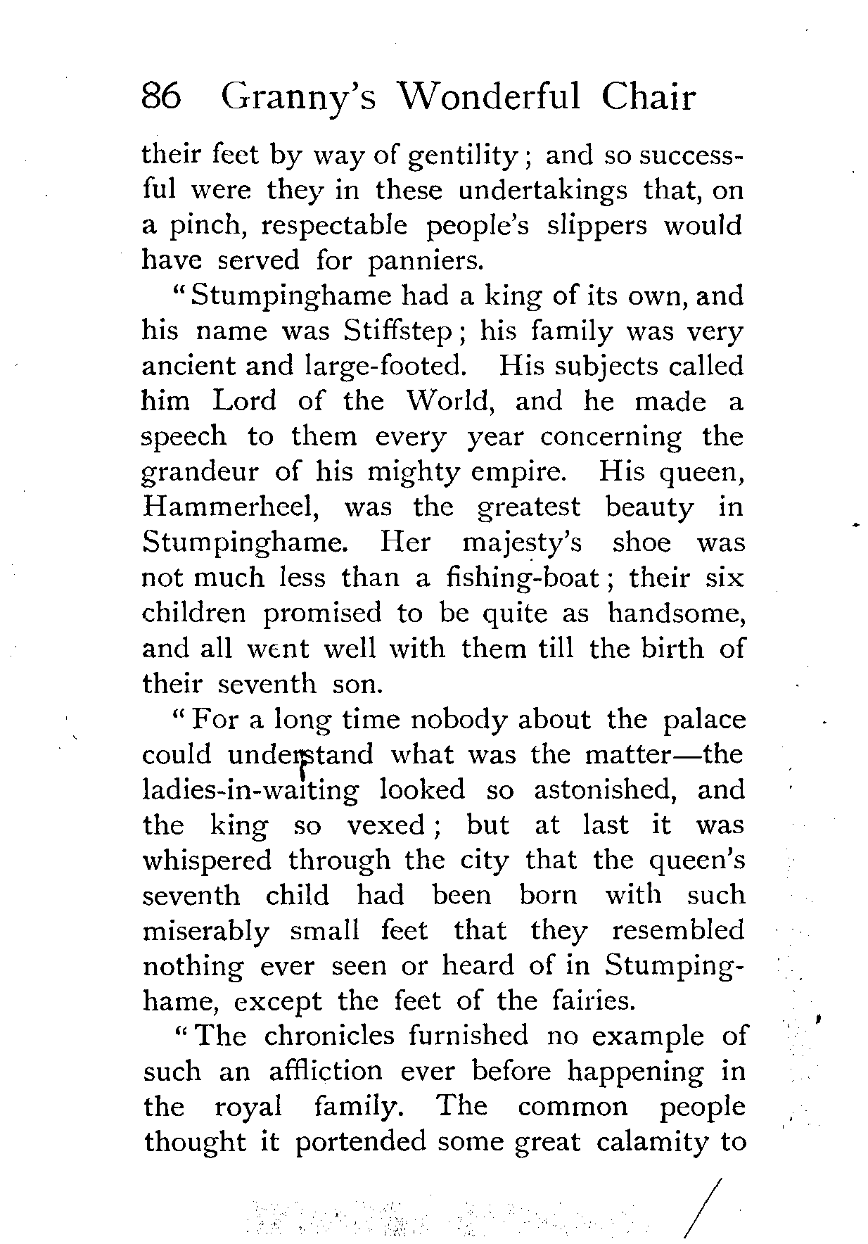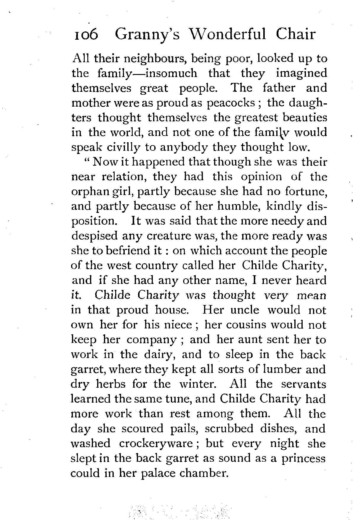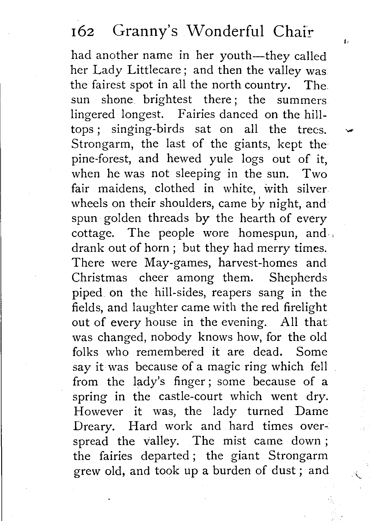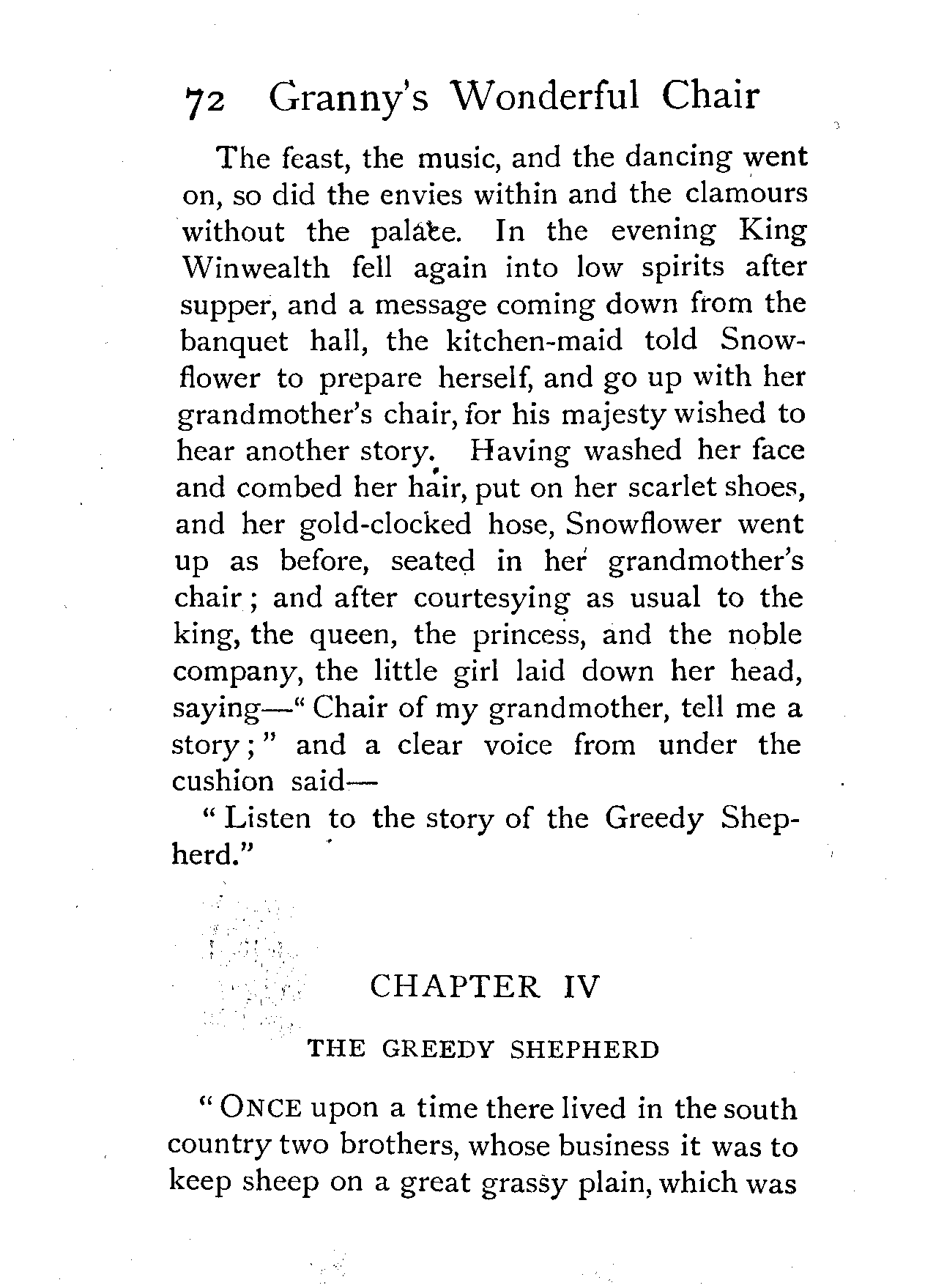 The writer of "Granny's Wonderful Chair" was a poet, and blind. That she was a poet the story tells on every page, but of her blindness it tells not a word. From beginning to end it is filled with pictures; each little tale has its own picturesque setting, its own vividly realised scenery. Her power of visualisation would be easy to understand had she become blind in the later years of her life, when the beauties of the physical world were impressed on her mind; but Frances Browne was blind from infancy. The pictures she gives us in her stories were created, in darkness, from material which came to her only through the words of others. In her work are no blurred lines or uncertainties, her drawing is done with a firm and vigorous hand. It would seem that the completeness of her calamity created, within her, that serenity of spirit which contrives the greatest triumphs in Life and in Art. Her endeavour was to realise the world independently of her own personal emotion and needs. She, who, out of her darkness and poverty, might have touched us so surely with her longing for her birthright of light, for her share of the world's good things, gives help and encouragement to the more fortunate.