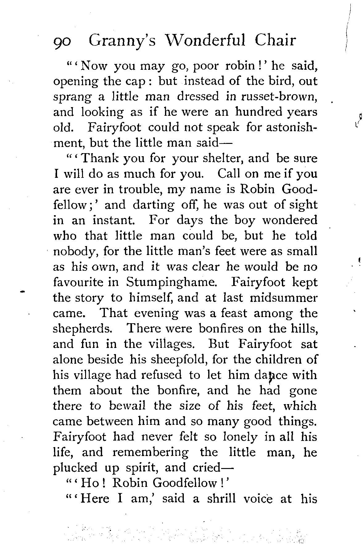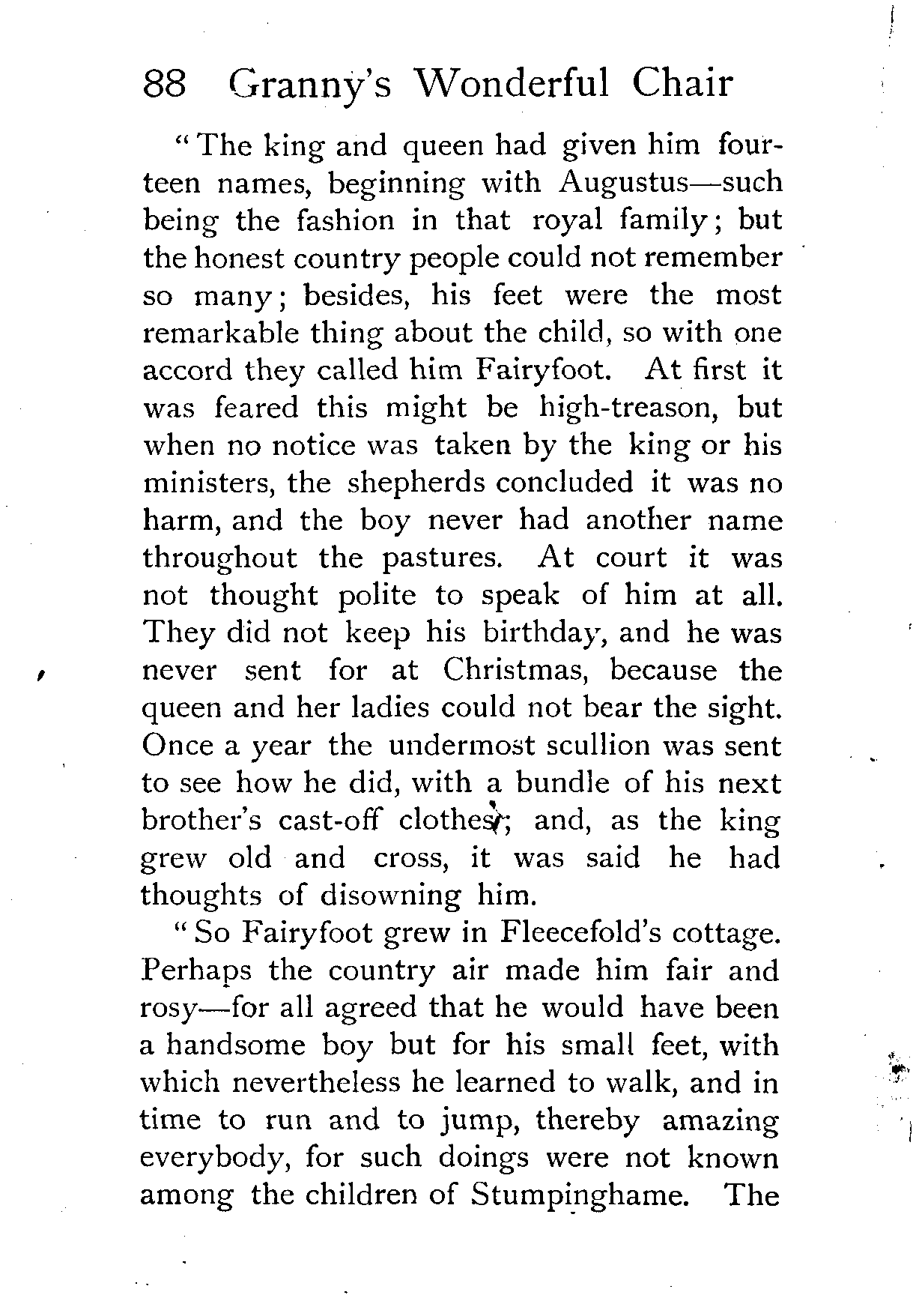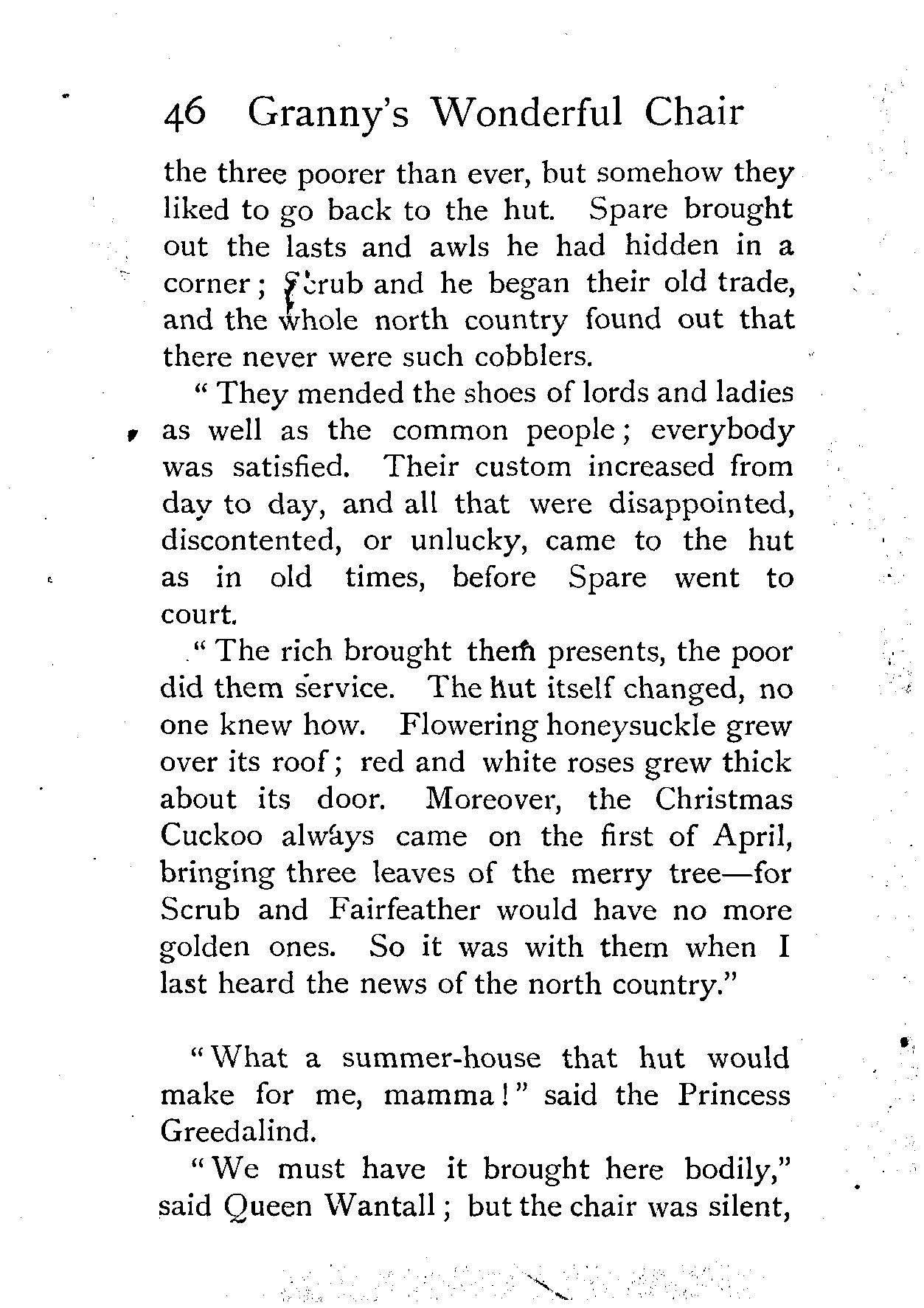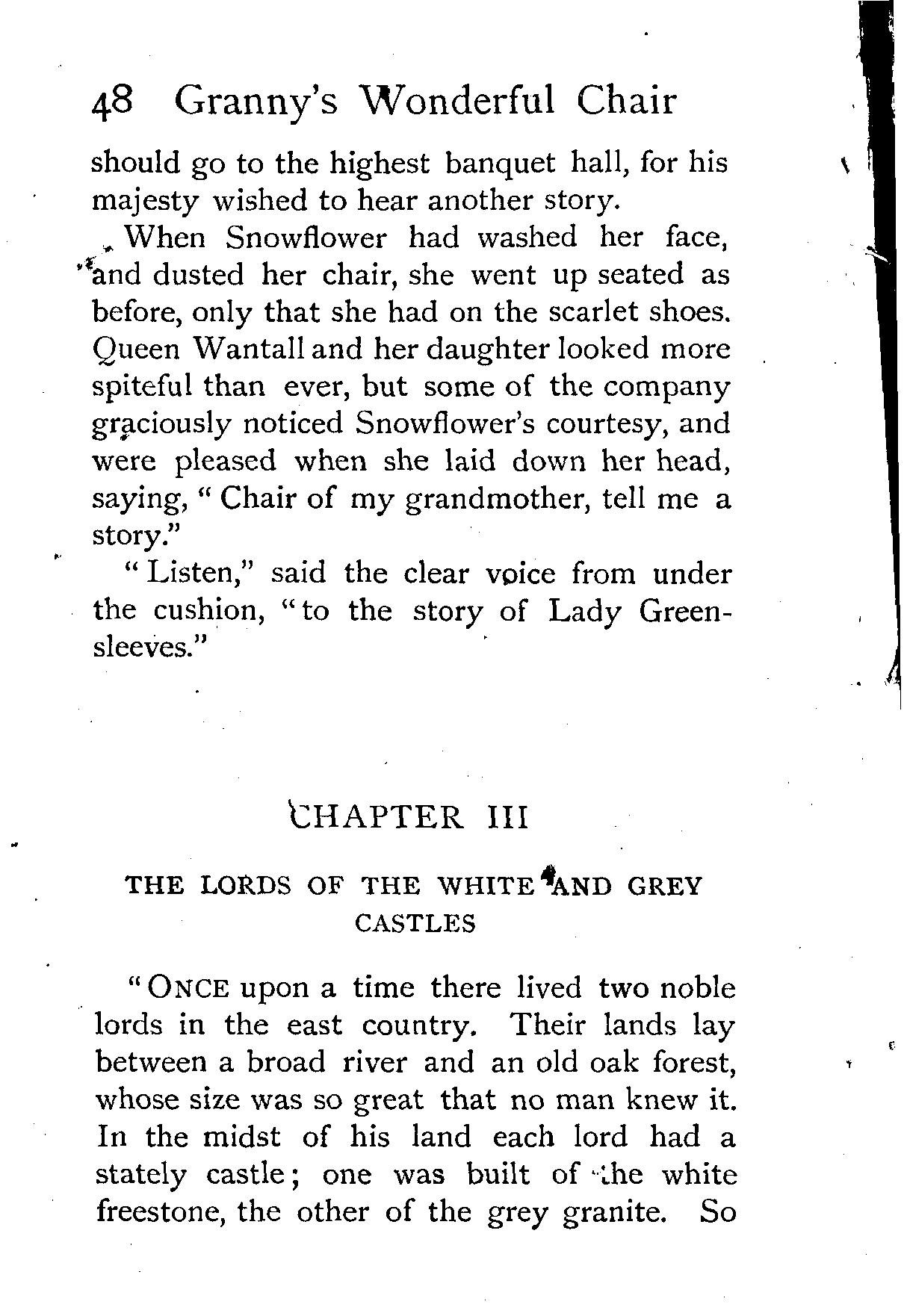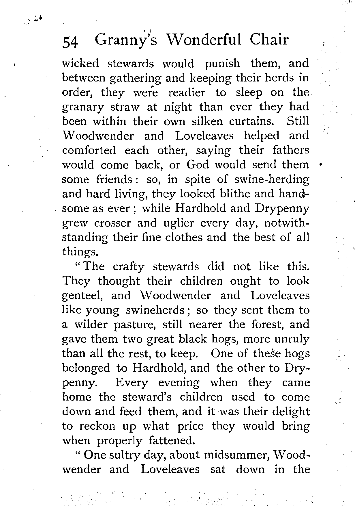 The writer of "Granny's Wonderful Chair" was a poet, and blind. That she was a poet the story tells on every page, but of her blindness it tells not a word. From beginning to end it is filled with pictures; each little tale has its own picturesque setting, its own vividly realised scenery. Her power of visualisation would be easy to understand had she become blind in the later years of her life, when the beauties of the physical world were impressed on her mind; but Frances Browne was blind from infancy. The pictures she gives us in her stories were created, in darkness, from material which came to her only through the words of others. In her work are no blurred lines or uncertainties, her drawing is done with a firm and vigorous hand. It would seem that the completeness of her calamity created, within her, that serenity of spirit which contrives the greatest triumphs in Life and in Art. Her endeavour was to realise the world independently of her own personal emotion and needs. She, who, out of her darkness and poverty, might have touched us so surely with her longing for her birthright of light, for her share of the world's good things, gives help and encouragement to the more fortunate.