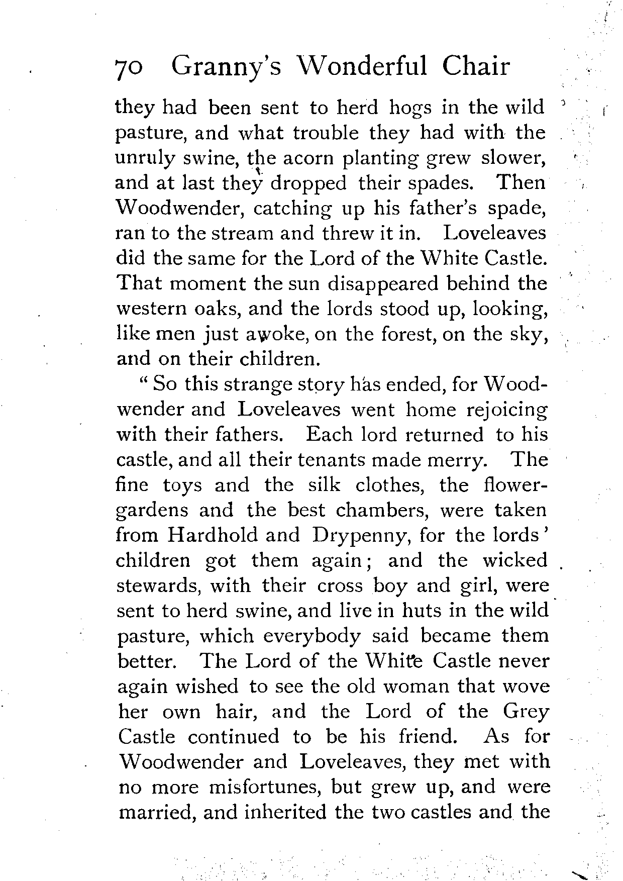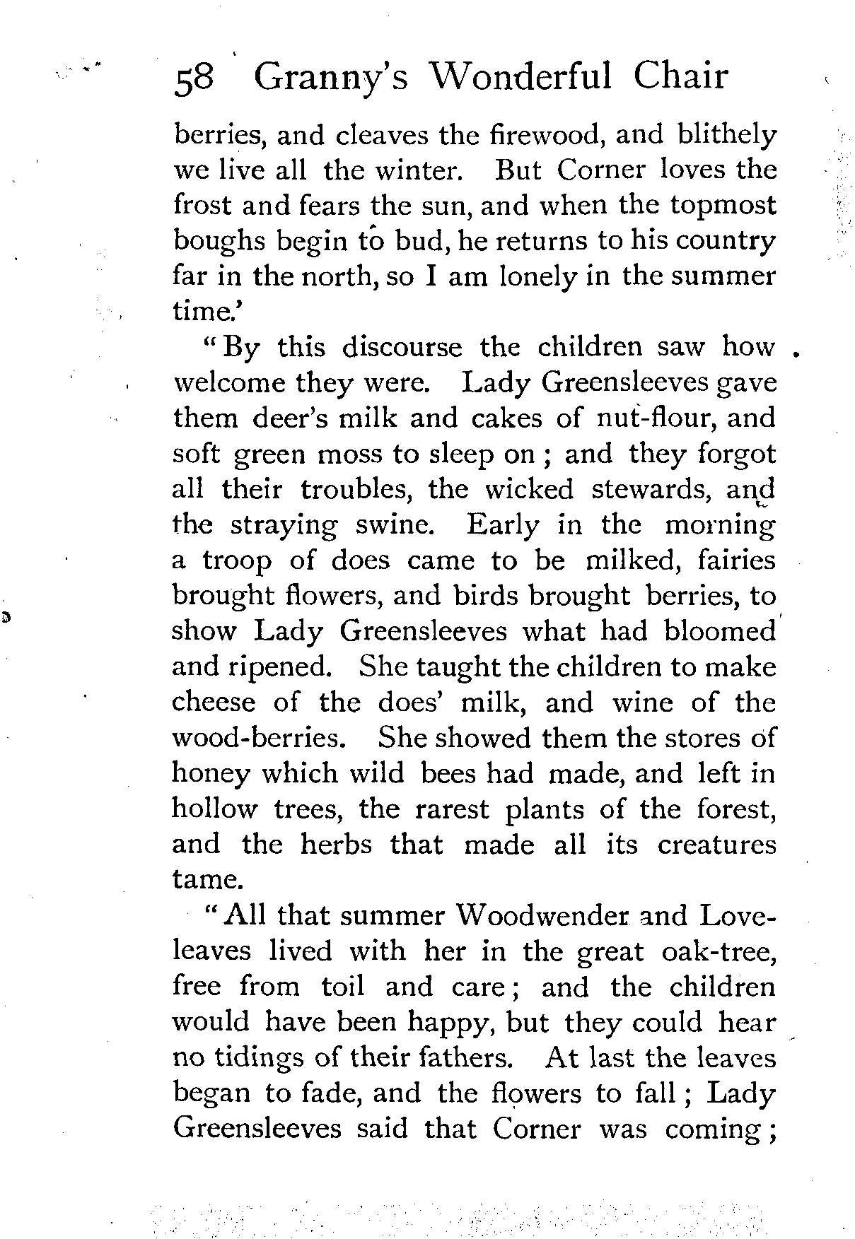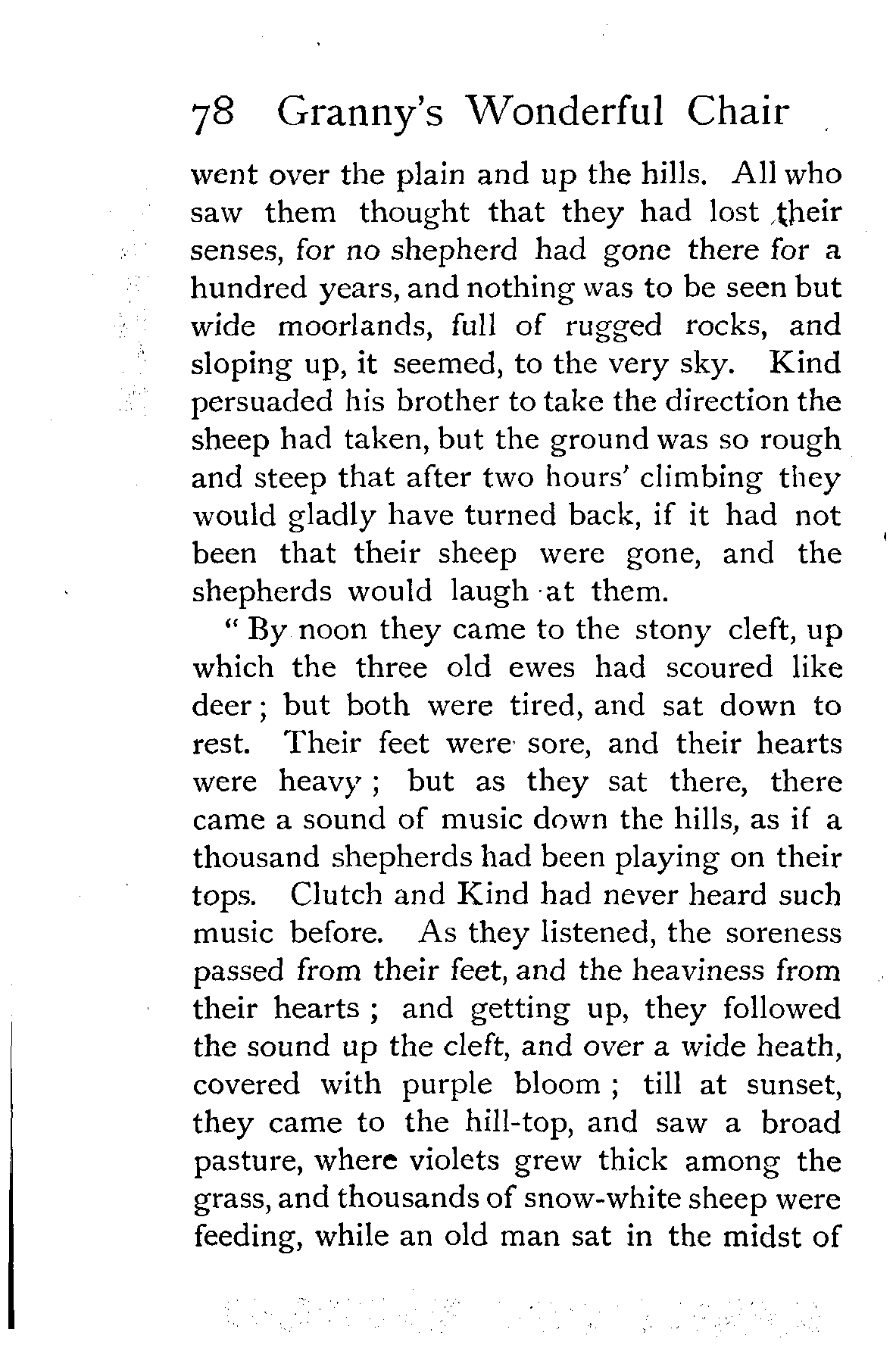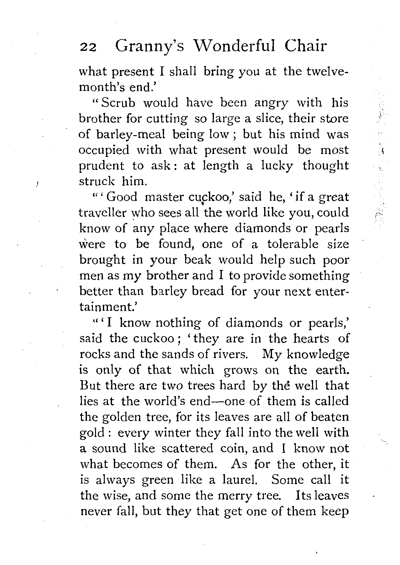 The writer of "Granny's Wonderful Chair" was a poet, and blind. That she was a poet the story tells on every page, but of her blindness it tells not a word. From beginning to end it is filled with pictures; each little tale has its own picturesque setting, its own vividly realised scenery. Her power of visualisation would be easy to understand had she become blind in the later years of her life, when the beauties of the physical world were impressed on her mind; but Frances Browne was blind from infancy. The pictures she gives us in her stories were created, in darkness, from material which came to her only through the words of others. In her work are no blurred lines or uncertainties, her drawing is done with a firm and vigorous hand. It would seem that the completeness of her calamity created, within her, that serenity of spirit which contrives the greatest triumphs in Life and in Art. Her endeavour was to realise the world independently of her own personal emotion and needs. She, who, out of her darkness and poverty, might have touched us so surely with her longing for her birthright of light, for her share of the world's good things, gives help and encouragement to the more fortunate.