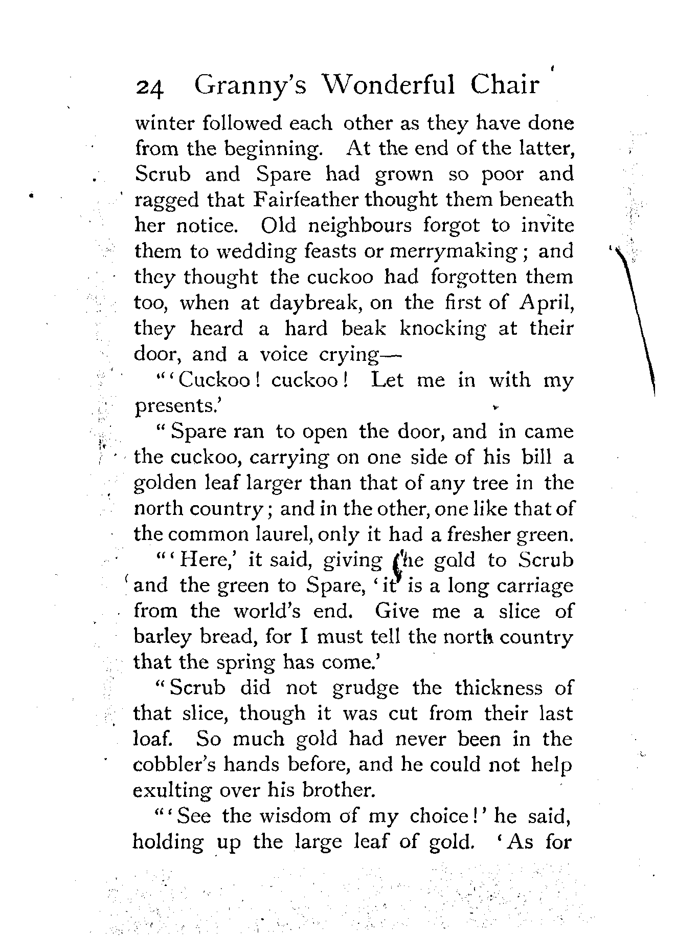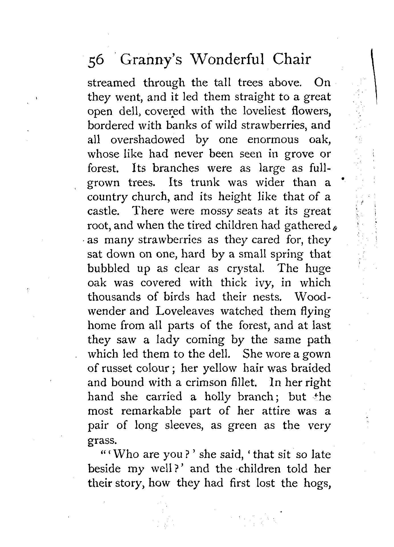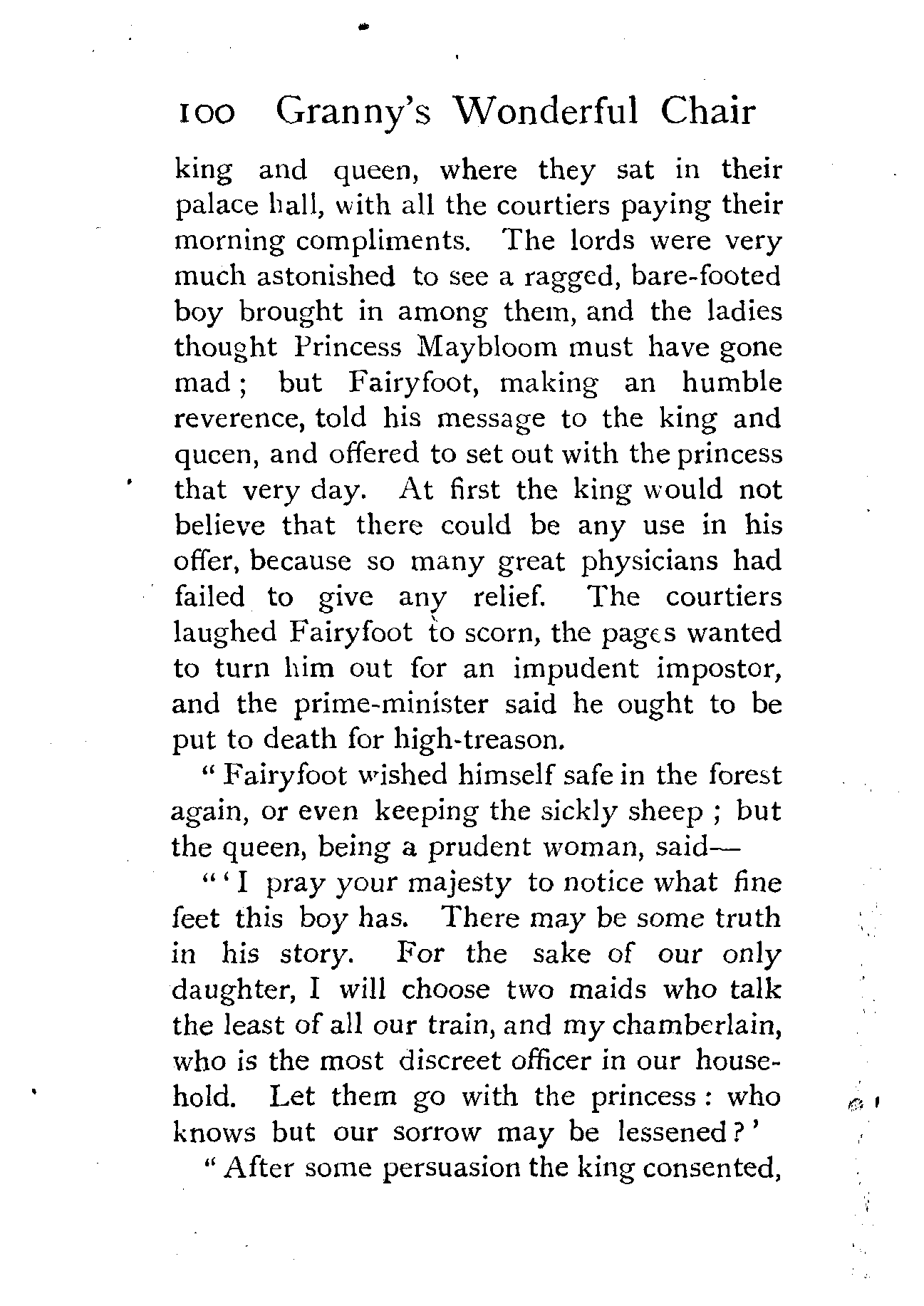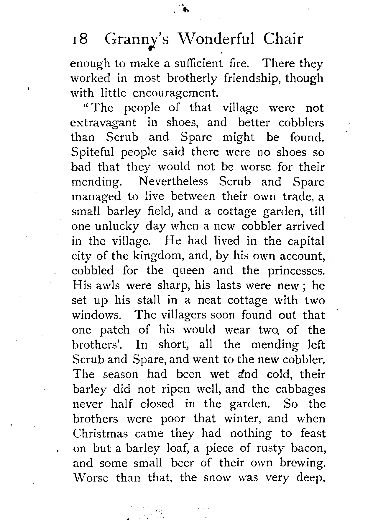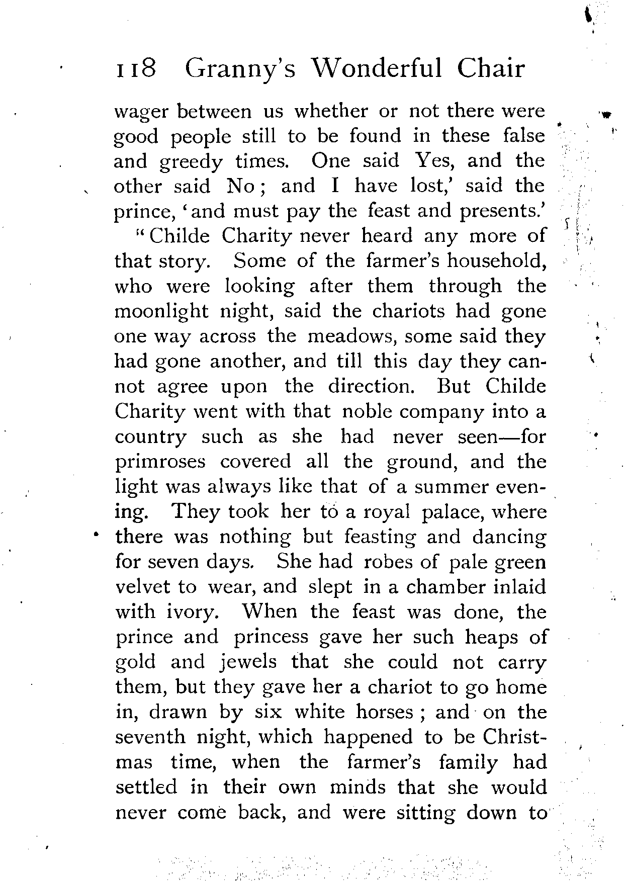 The writer of "Granny's Wonderful Chair" was a poet, and blind. That she was a poet the story tells on every page, but of her blindness it tells not a word. From beginning to end it is filled with pictures; each little tale has its own picturesque setting, its own vividly realised scenery. Her power of visualisation would be easy to understand had she become blind in the later years of her life, when the beauties of the physical world were impressed on her mind; but Frances Browne was blind from infancy. The pictures she gives us in her stories were created, in darkness, from material which came to her only through the words of others. In her work are no blurred lines or uncertainties, her drawing is done with a firm and vigorous hand. It would seem that the completeness of her calamity created, within her, that serenity of spirit which contrives the greatest triumphs in Life and in Art. Her endeavour was to realise the world independently of her own personal emotion and needs. She, who, out of her darkness and poverty, might have touched us so surely with her longing for her birthright of light, for her share of the world's good things, gives help and encouragement to the more fortunate.