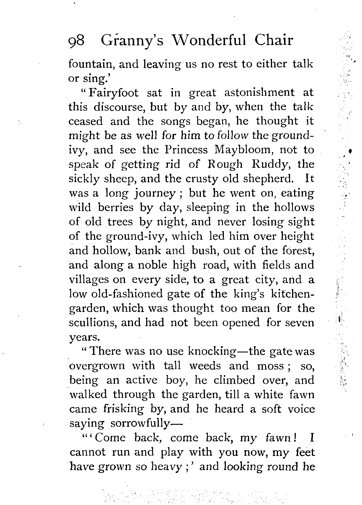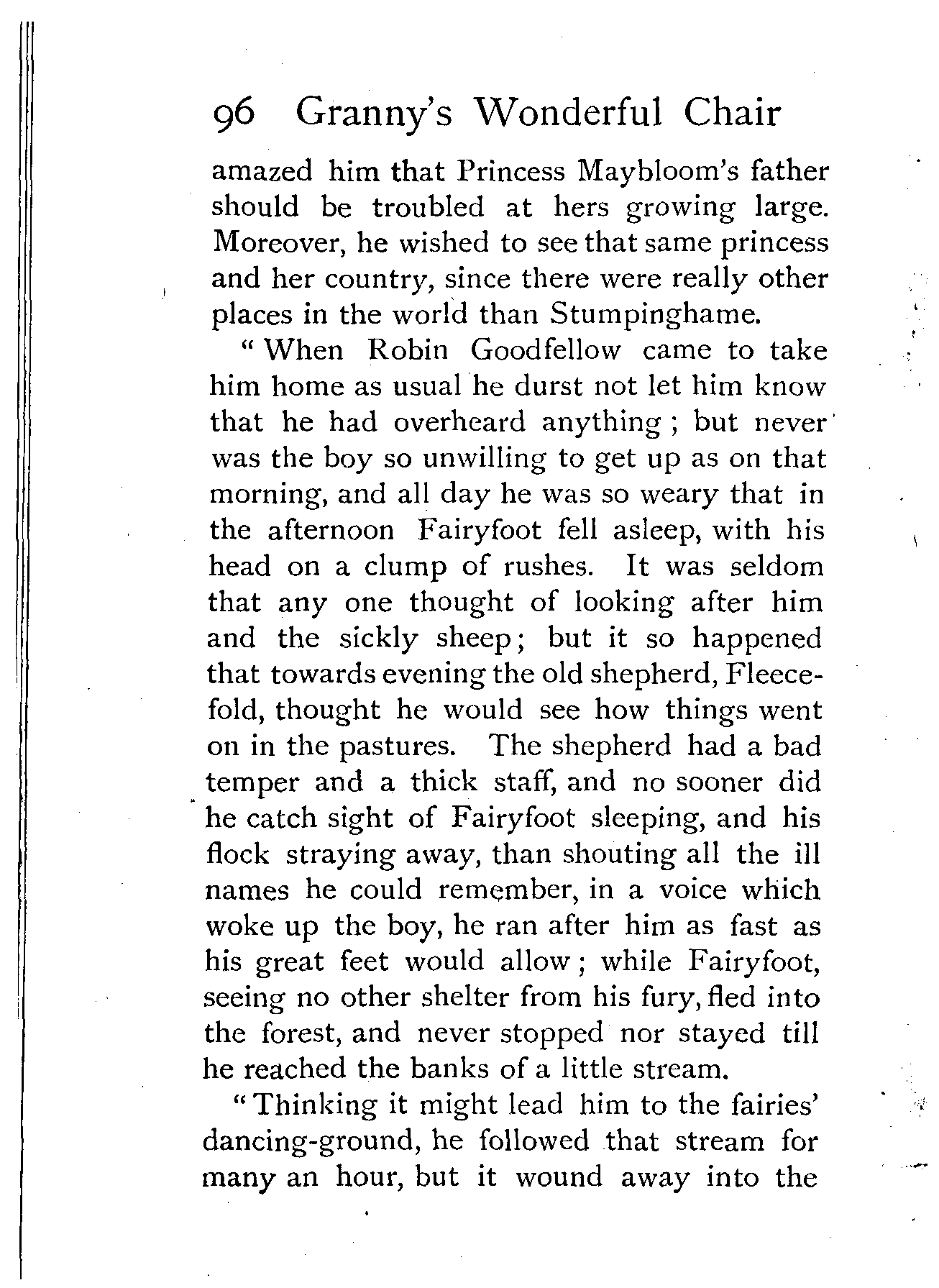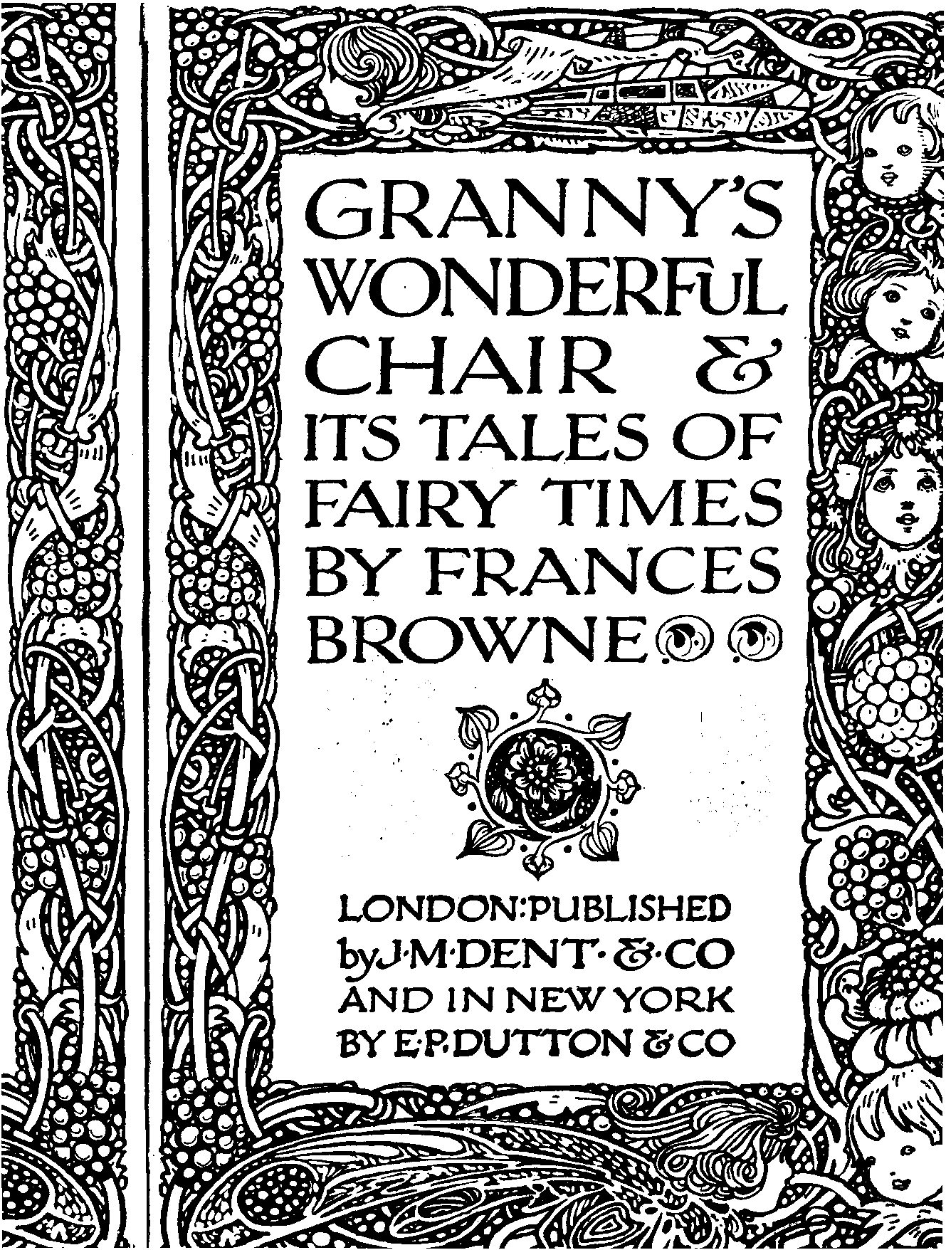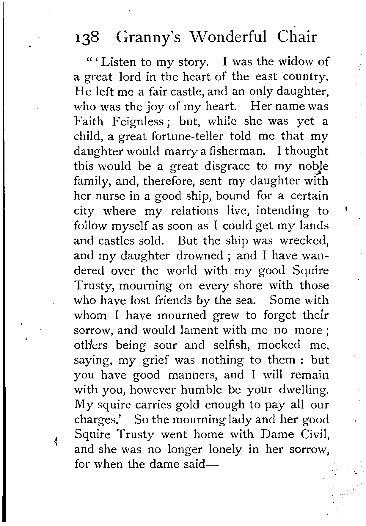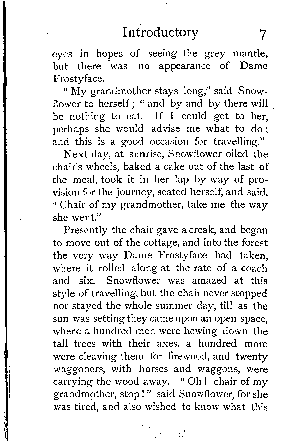 The writer of "Granny's Wonderful Chair" was a poet, and blind. That she was a poet the story tells on every page, but of her blindness it tells not a word. From beginning to end it is filled with pictures; each little tale has its own picturesque setting, its own vividly realised scenery. Her power of visualisation would be easy to understand had she become blind in the later years of her life, when the beauties of the physical world were impressed on her mind; but Frances Browne was blind from infancy. The pictures she gives us in her stories were created, in darkness, from material which came to her only through the words of others. In her work are no blurred lines or uncertainties, her drawing is done with a firm and vigorous hand. It would seem that the completeness of her calamity created, within her, that serenity of spirit which contrives the greatest triumphs in Life and in Art. Her endeavour was to realise the world independently of her own personal emotion and needs. She, who, out of her darkness and poverty, might have touched us so surely with her longing for her birthright of light, for her share of the world's good things, gives help and encouragement to the more fortunate.