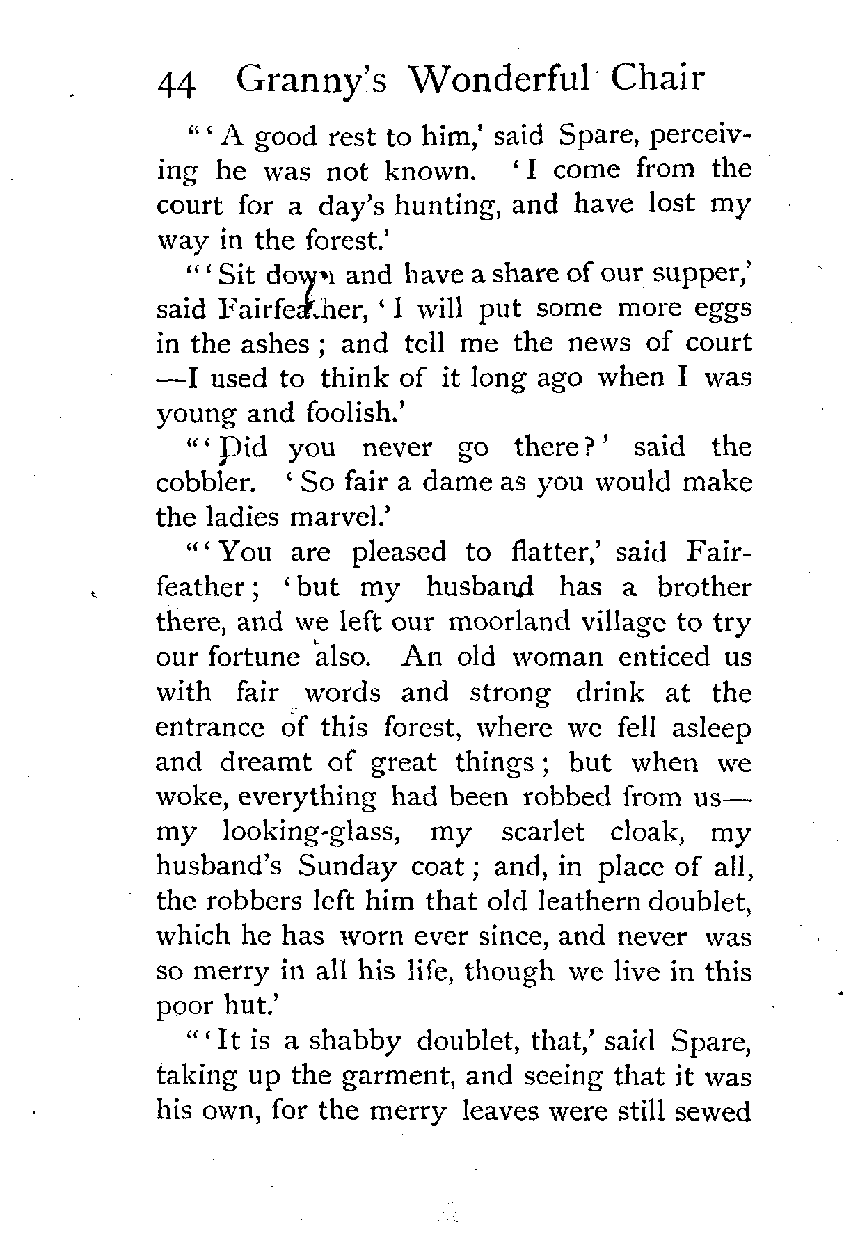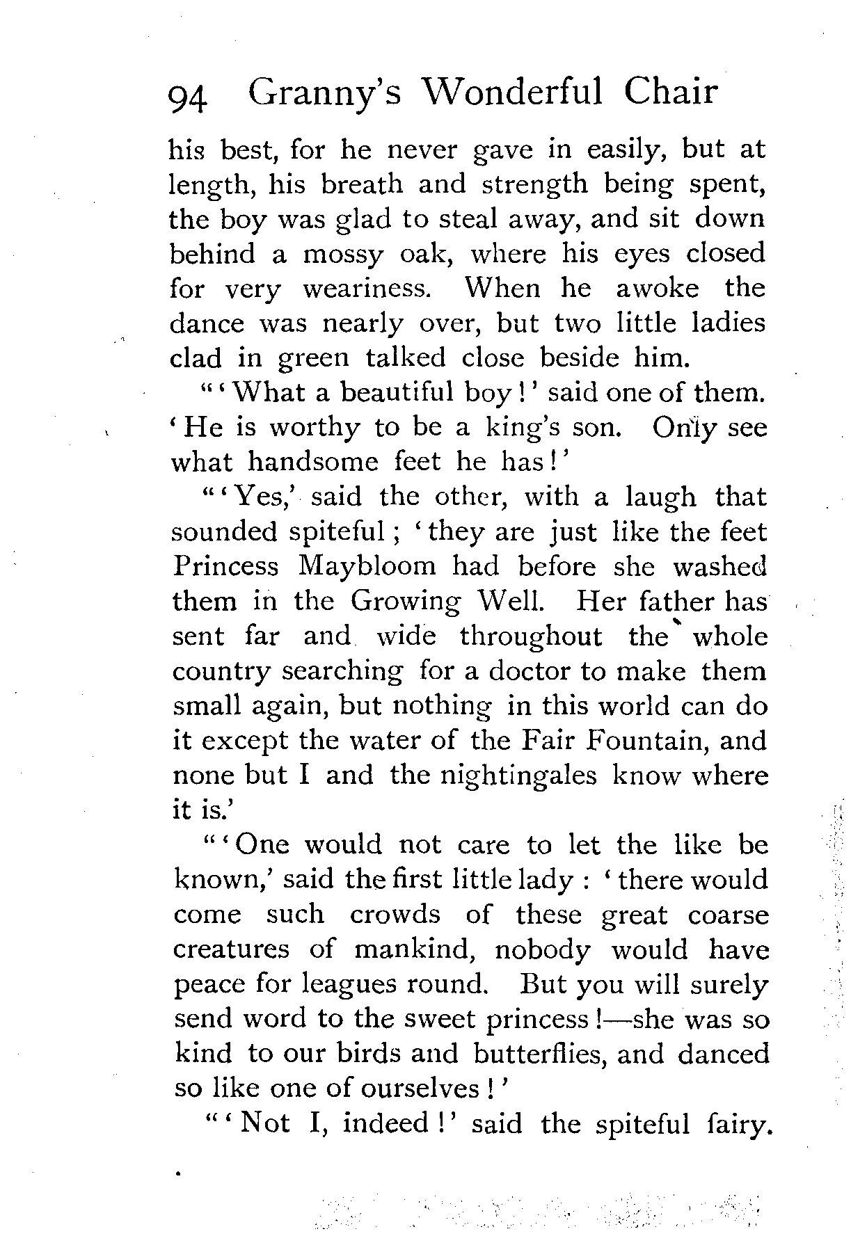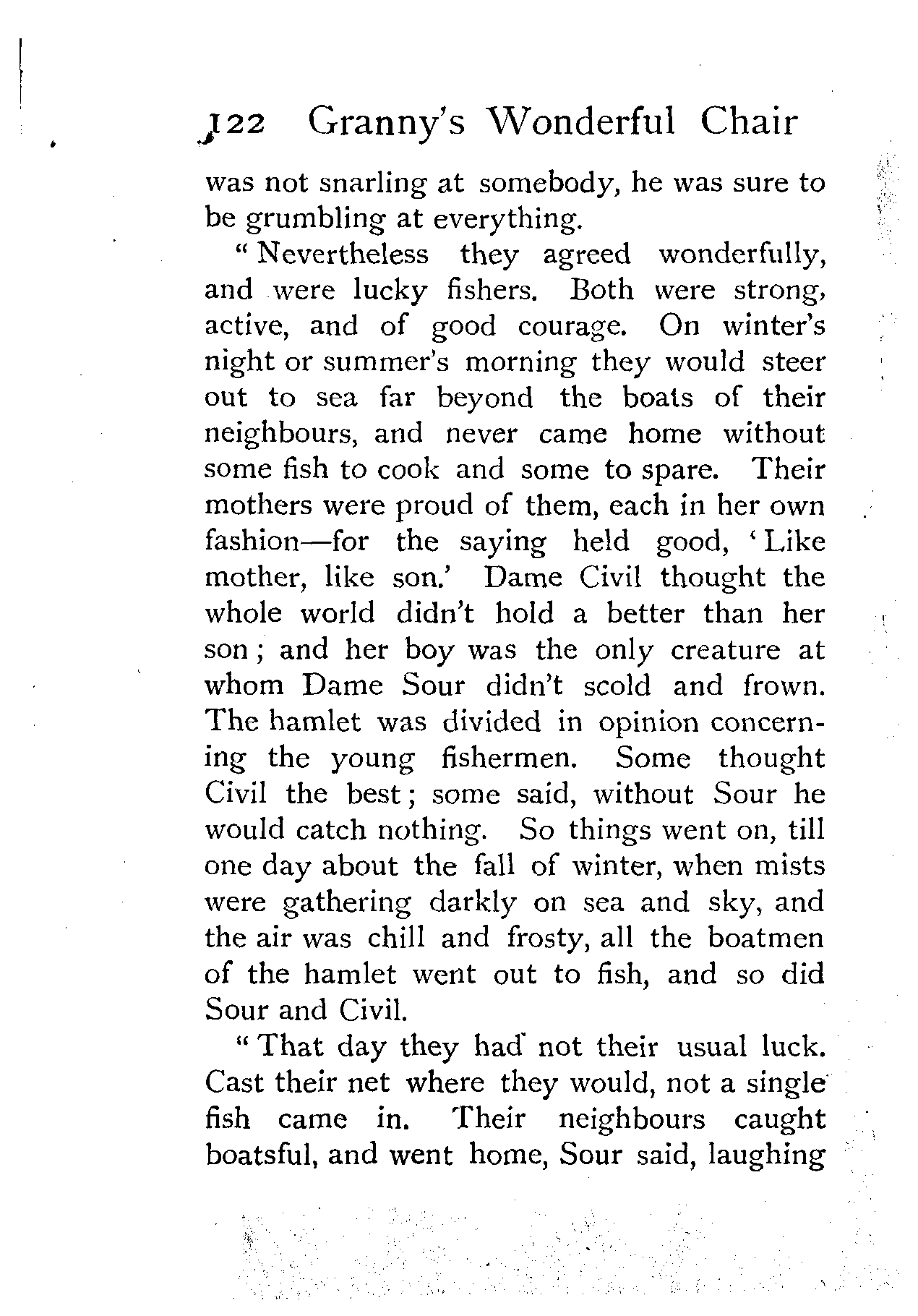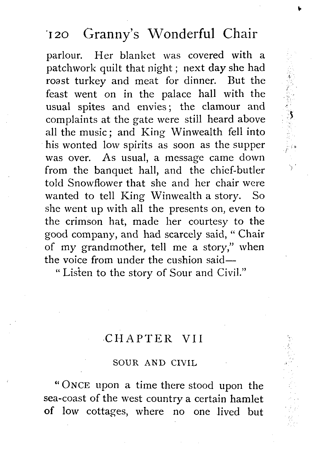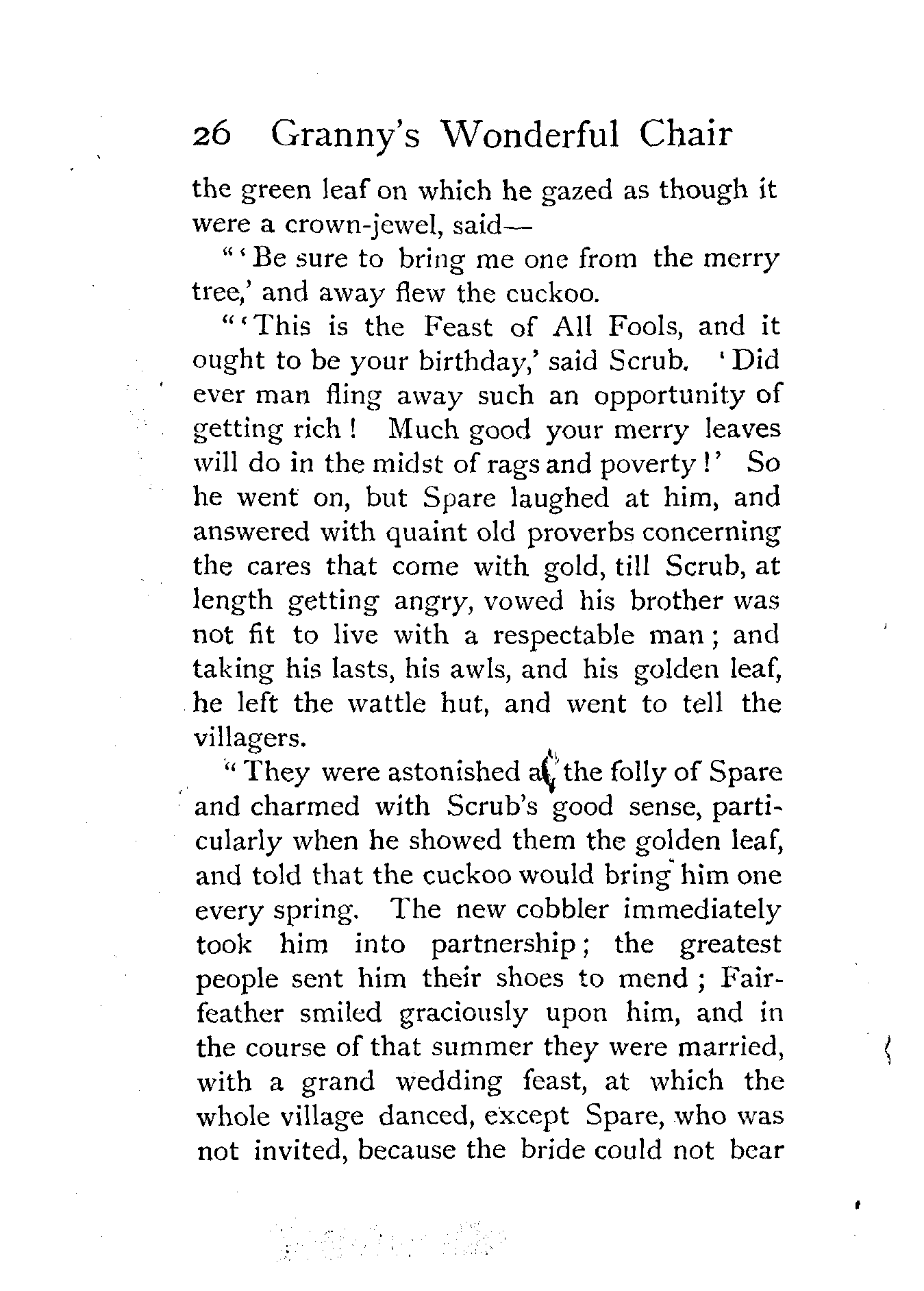The writer of "Granny's Wonderful Chair" was a poet, and blind. That she was a poet the story tells on every page, but of her blindness it tells not a word. From beginning to end it is filled with pictures; each little tale has its own picturesque setting, its own vividly realised scenery. Her power of visualisation would be easy to understand had she become blind in the later years of her life, when the beauties of the physical world were impressed on her mind; but Frances Browne was blind from infancy. The pictures she gives us in her stories were created, in darkness, from material which came to her only through the words of others. In her work are no blurred lines or uncertainties, her drawing is done with a firm and vigorous hand. It would seem that the completeness of her calamity created, within her, that serenity of spirit which contrives the greatest triumphs in Life and in Art. Her endeavour was to realise the world independently of her own personal emotion and needs. She, who, out of her darkness and poverty, might have touched us so surely with her longing for her birthright of light, for her share of the world's good things, gives help and encouragement to the more fortunate.