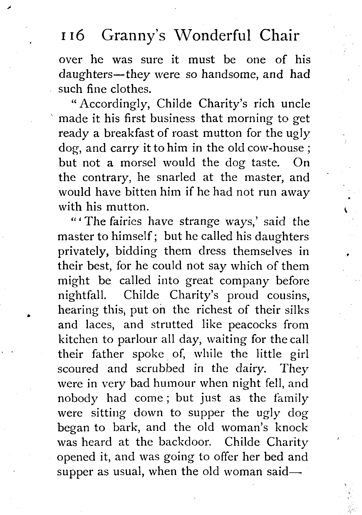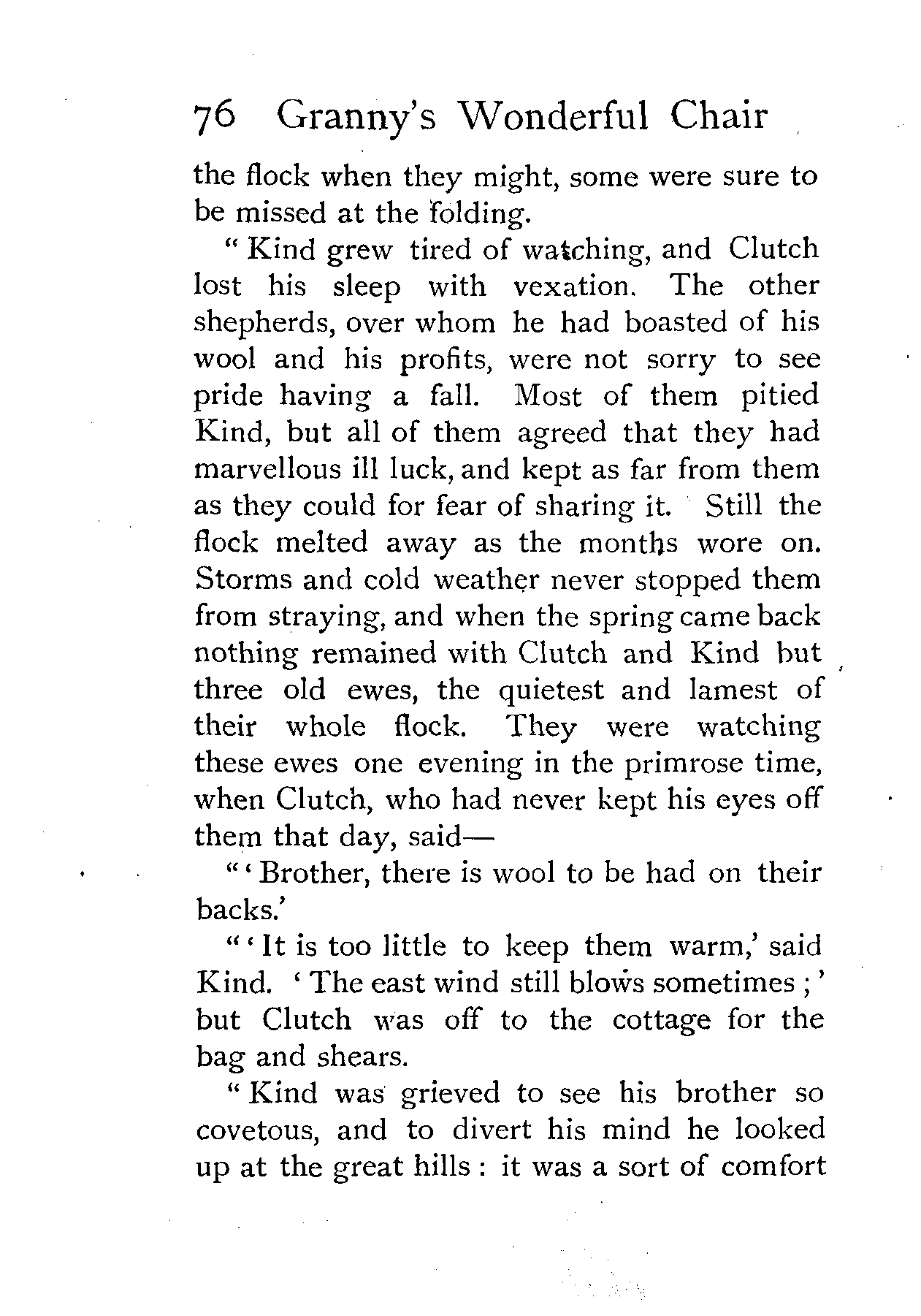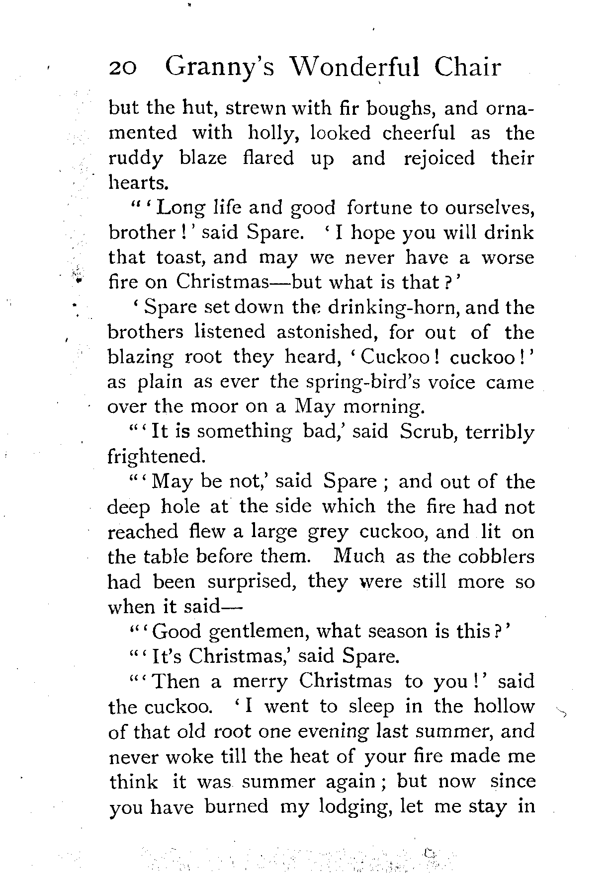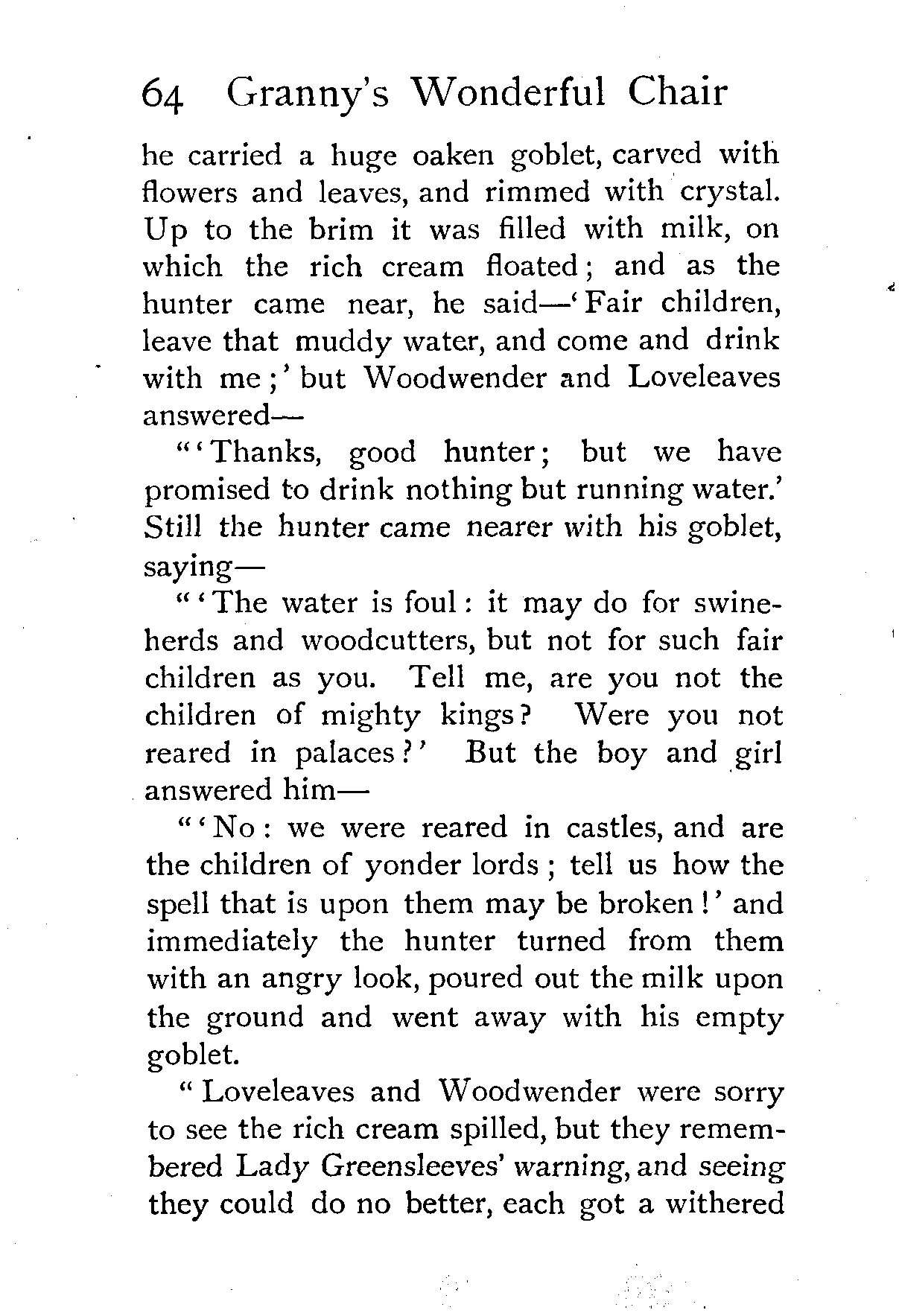 The writer of "Granny's Wonderful Chair" was a poet, and blind. That she was a poet the story tells on every page, but of her blindness it tells not a word. From beginning to end it is filled with pictures; each little tale has its own picturesque setting, its own vividly realised scenery. Her power of visualisation would be easy to understand had she become blind in the later years of her life, when the beauties of the physical world were impressed on her mind; but Frances Browne was blind from infancy. The pictures she gives us in her stories were created, in darkness, from material which came to her only through the words of others. In her work are no blurred lines or uncertainties, her drawing is done with a firm and vigorous hand. It would seem that the completeness of her calamity created, within her, that serenity of spirit which contrives the greatest triumphs in Life and in Art. Her endeavour was to realise the world independently of her own personal emotion and needs. She, who, out of her darkness and poverty, might have touched us so surely with her longing for her birthright of light, for her share of the world's good things, gives help and encouragement to the more fortunate.