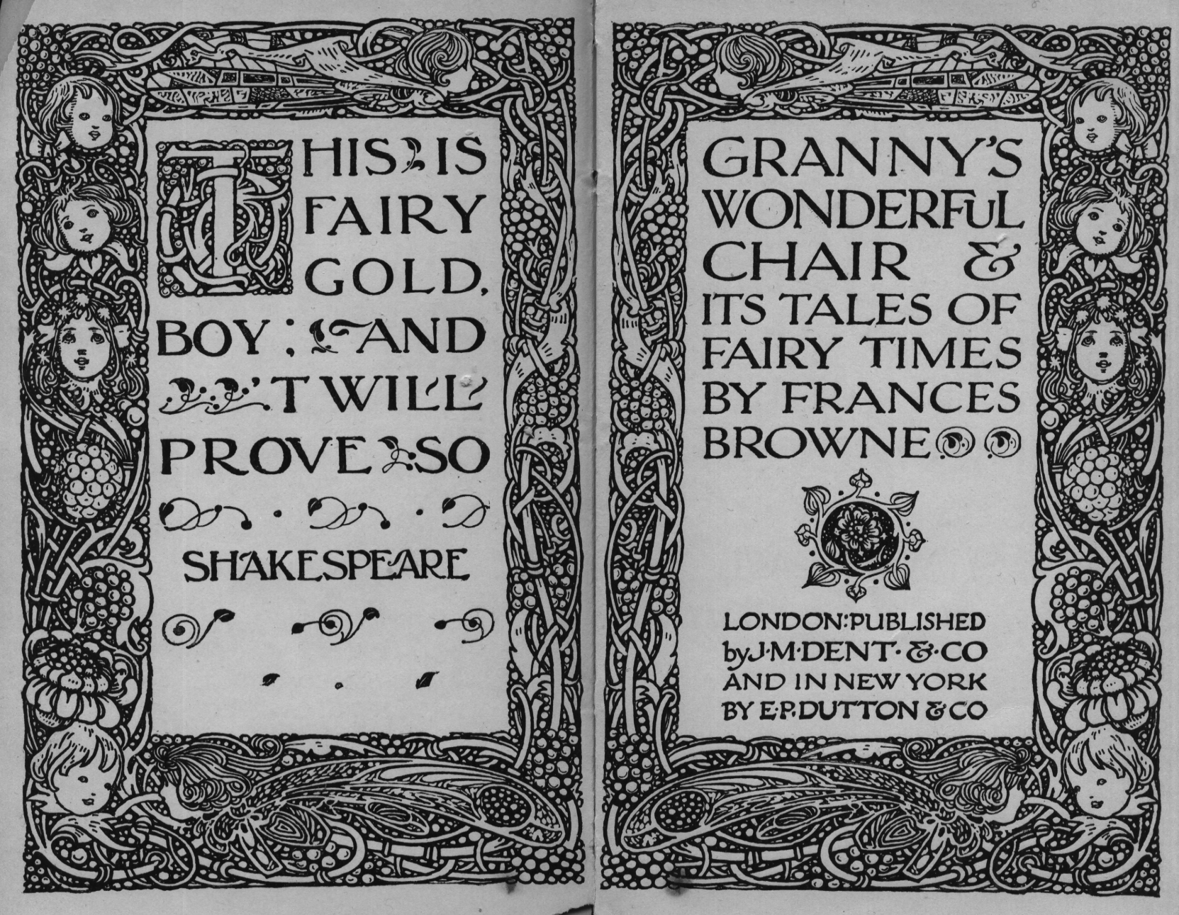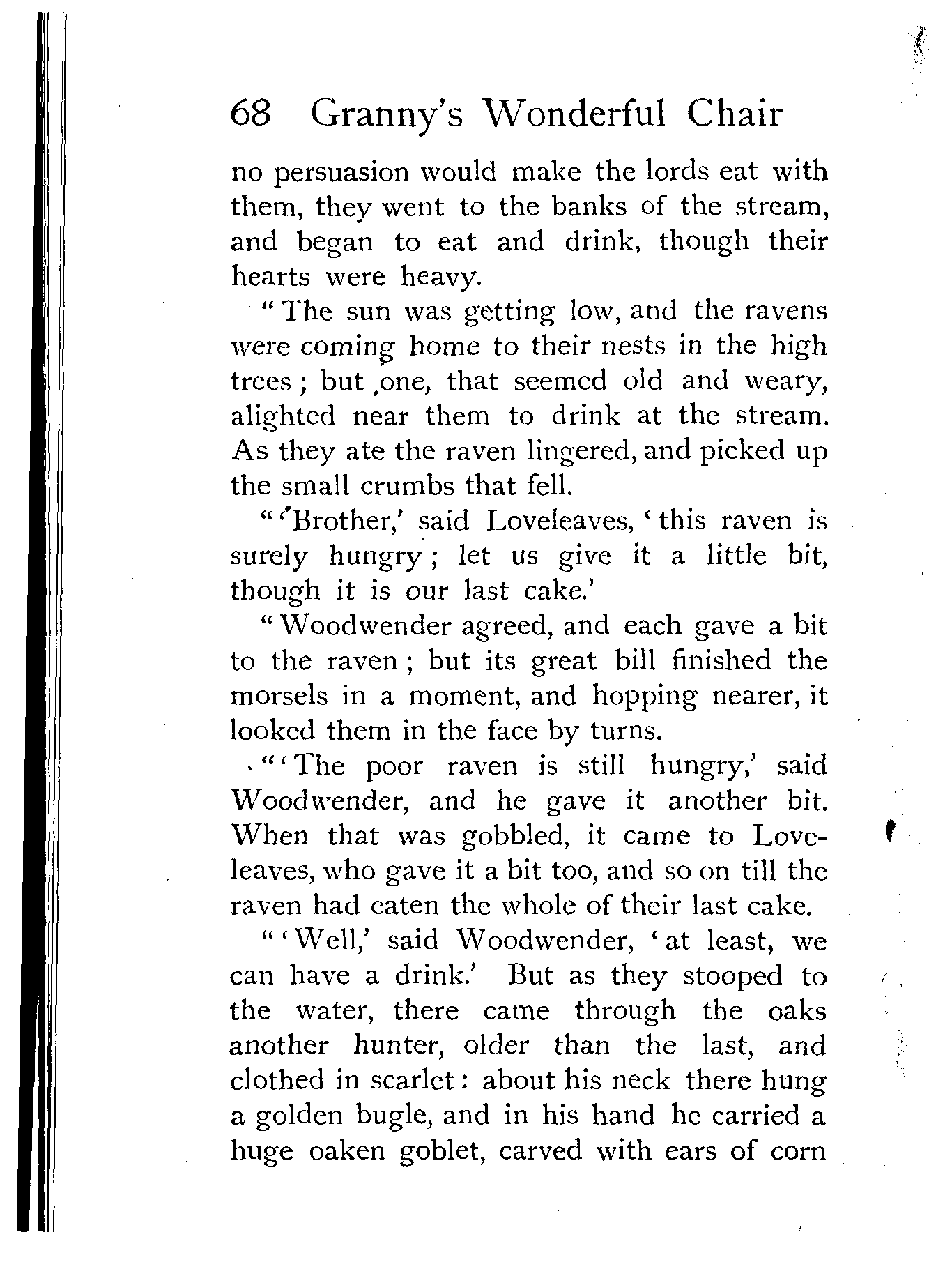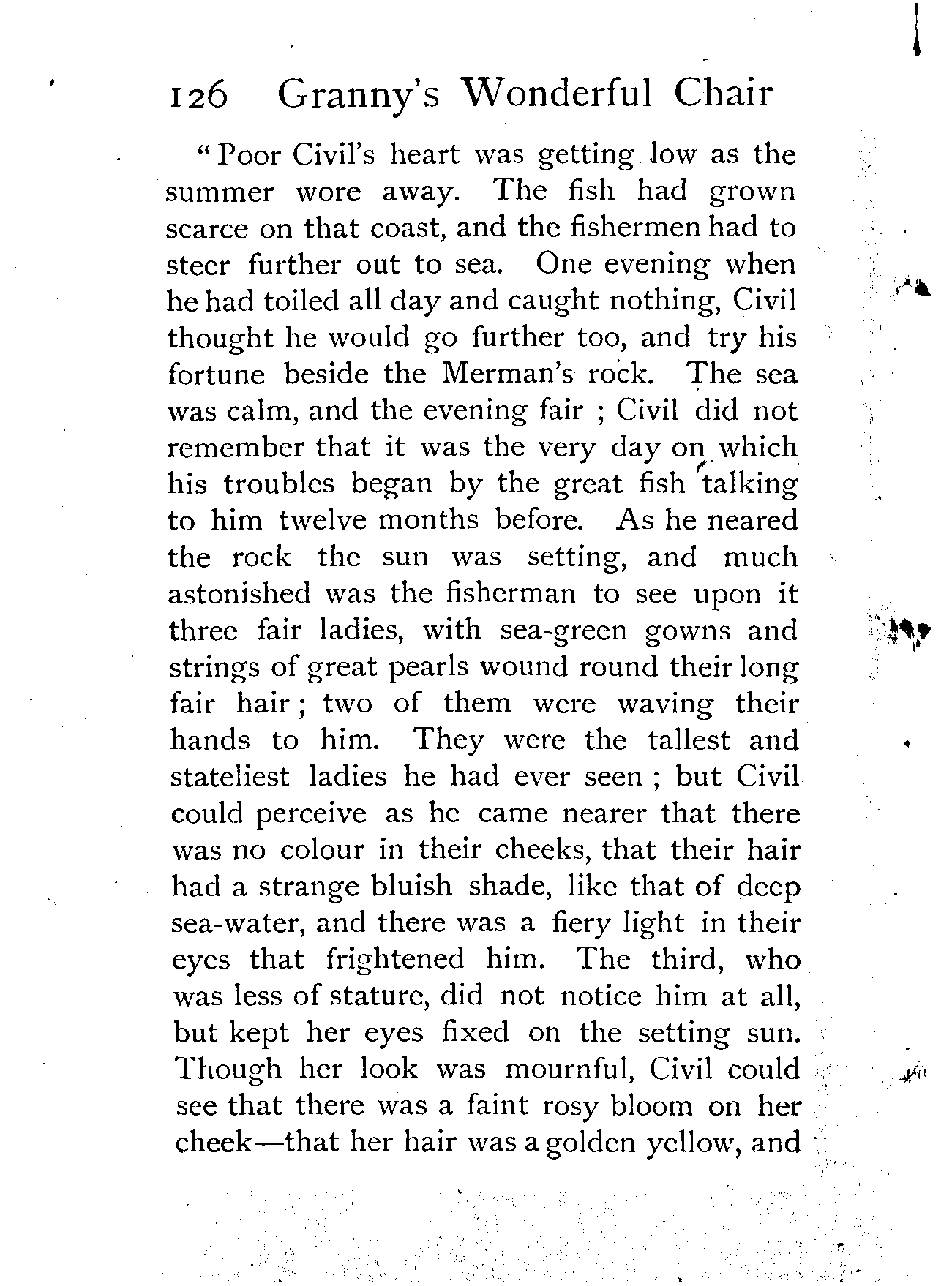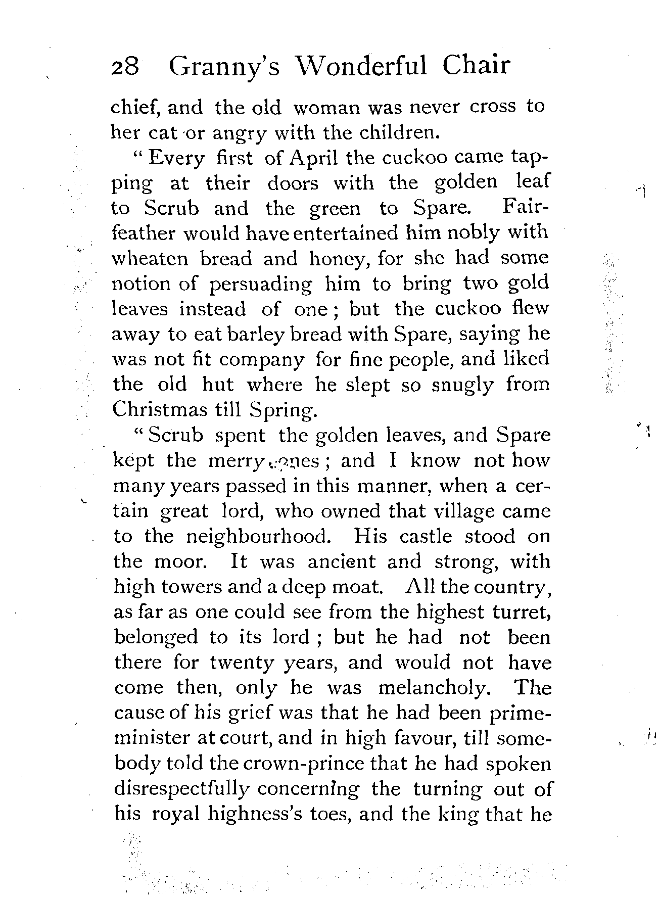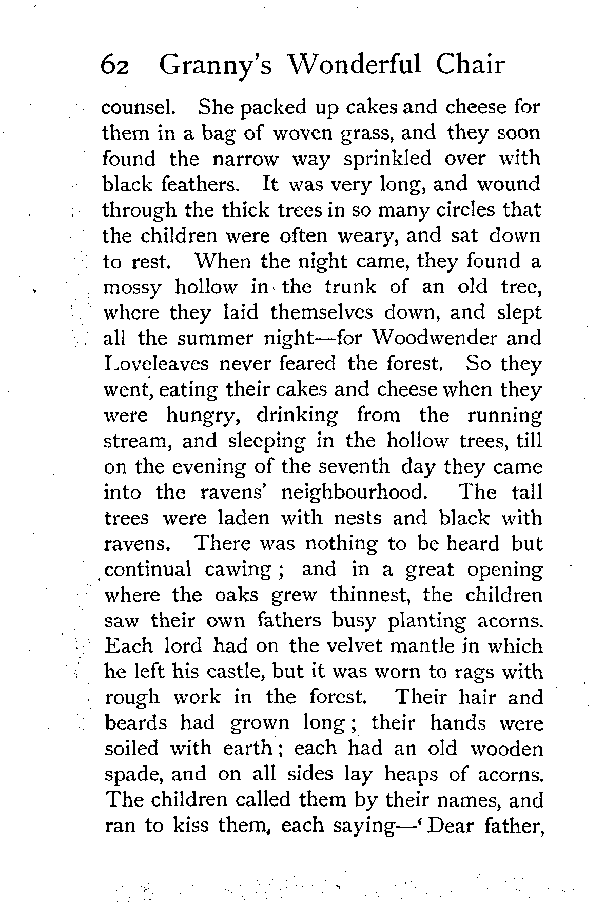 The writer of "Granny's Wonderful Chair" was a poet, and blind. That she was a poet the story tells on every page, but of her blindness it tells not a word. From beginning to end it is filled with pictures; each little tale has its own picturesque setting, its own vividly realised scenery. Her power of visualisation would be easy to understand had she become blind in the later years of her life, when the beauties of the physical world were impressed on her mind; but Frances Browne was blind from infancy. The pictures she gives us in her stories were created, in darkness, from material which came to her only through the words of others. In her work are no blurred lines or uncertainties, her drawing is done with a firm and vigorous hand. It would seem that the completeness of her calamity created, within her, that serenity of spirit which contrives the greatest triumphs in Life and in Art. Her endeavour was to realise the world independently of her own personal emotion and needs. She, who, out of her darkness and poverty, might have touched us so surely with her longing for her birthright of light, for her share of the world's good things, gives help and encouragement to the more fortunate.