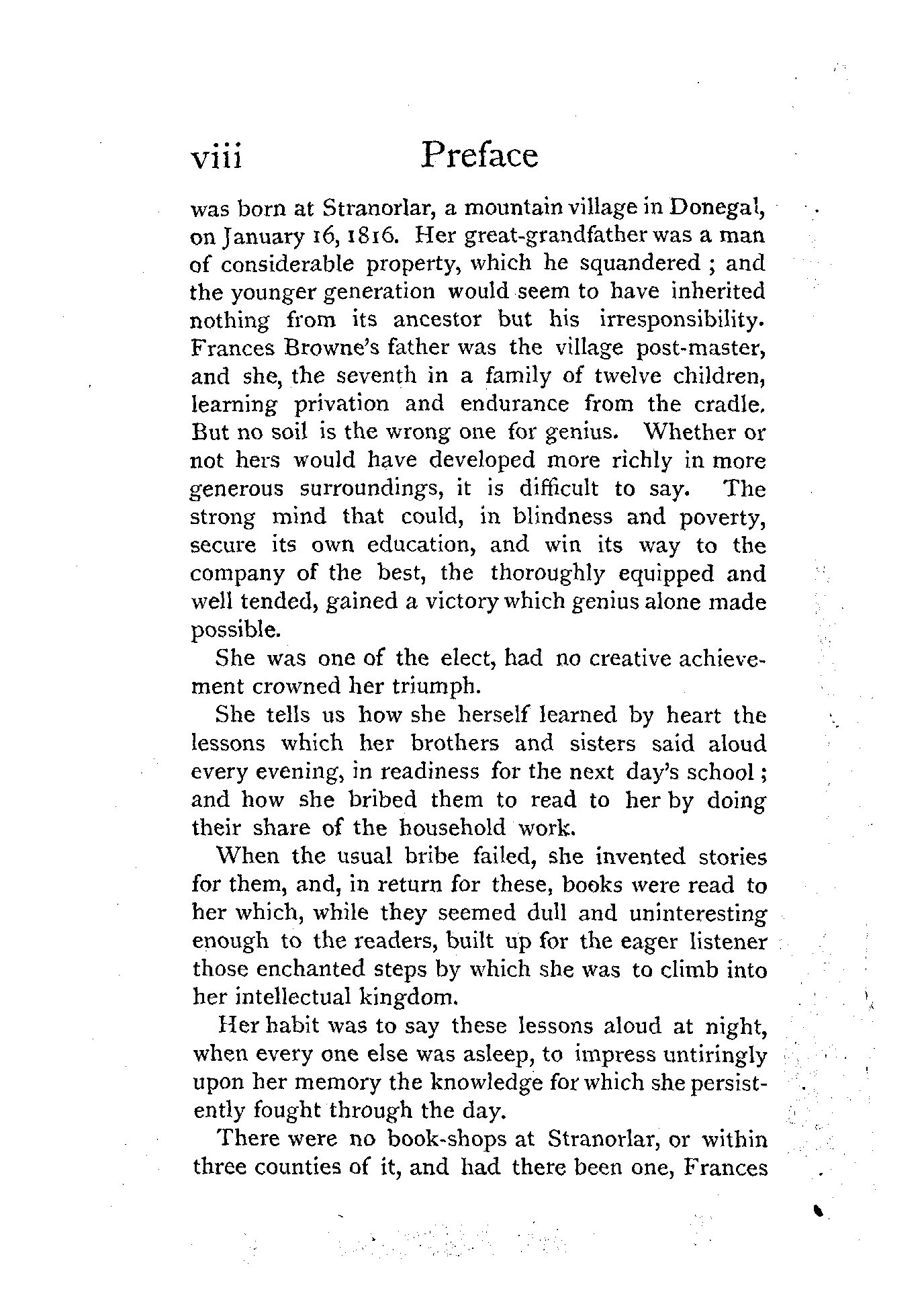The odds against Frances Browne were heavy. She [Pg viii] was born at Stranorlar, a mountain village in Donegal, on January 16, 1816. Her great-grandfather was a man of considerable property, which he squandered; and the younger generation would seem to have inherited nothing from its ancestor but his irresponsibility. Frances Browne's father was the village post-master, and she, the seventh in a family of twelve children, learning privation and endurance from the cradle. But no soil is the wrong one for genius. Whether or not hers would have developed more richly in more generous surroundings, it is difficult to say. The strong mind that could, in blindness and poverty, secure its own education, and win its way to the company of the best, the thoroughly equipped and well tended, gained a victory which genius alone made possible.