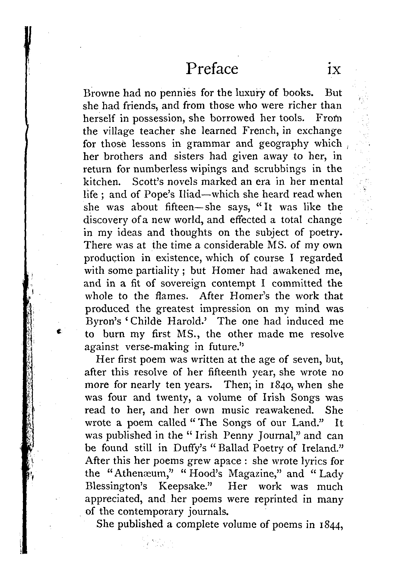 There were no book-shops at Stranorlar, or within three counties of it, and had there been one, Frances [Pg ix] Browne had no pennies for the luxury of books. But she had friends, and from those who were richer than herself in possession, she borrowed her tools. From the village teacher she learned French, in exchange for those lessons in grammar and geography which, her brothers and sisters had given away to her, in return for numberless wipings and scrubbings in the kitchen. Scott's novels marked an era in her mental life; and of Pope's Iliad—which she heard read when she was about fifteen—she says, "It was like the discovery of a new world, and effected a total change in my ideas and thoughts on the subject of poetry. There was at the time a considerable MS. of my own production in existence, which of course I regarded with some partiality; but Homer had awakened me, and in a fit of sovereign contempt I committed the whole to the flames. After Homer's the work that produced the greatest impression on my mind was Byron's 'Childe Harold.' The one had induced me to burn my first MS., the other made me resolve against verse-making in future."